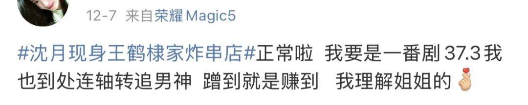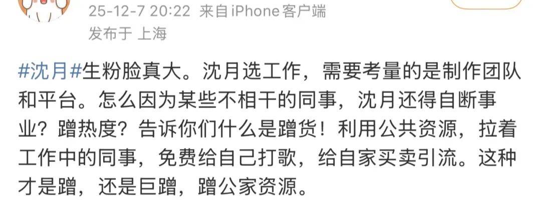 一边吐槽王鹤棣粉丝“脸也太大了吧”,沈月选资源看的是班底和平台,凭什么要为了不相干的人放弃机会?真要论蹭热度,那些借着工作合作的便利,拉着同事免费给自家歌和生意引流的,才是实打实的巨蹭,纯纯占公家便宜。