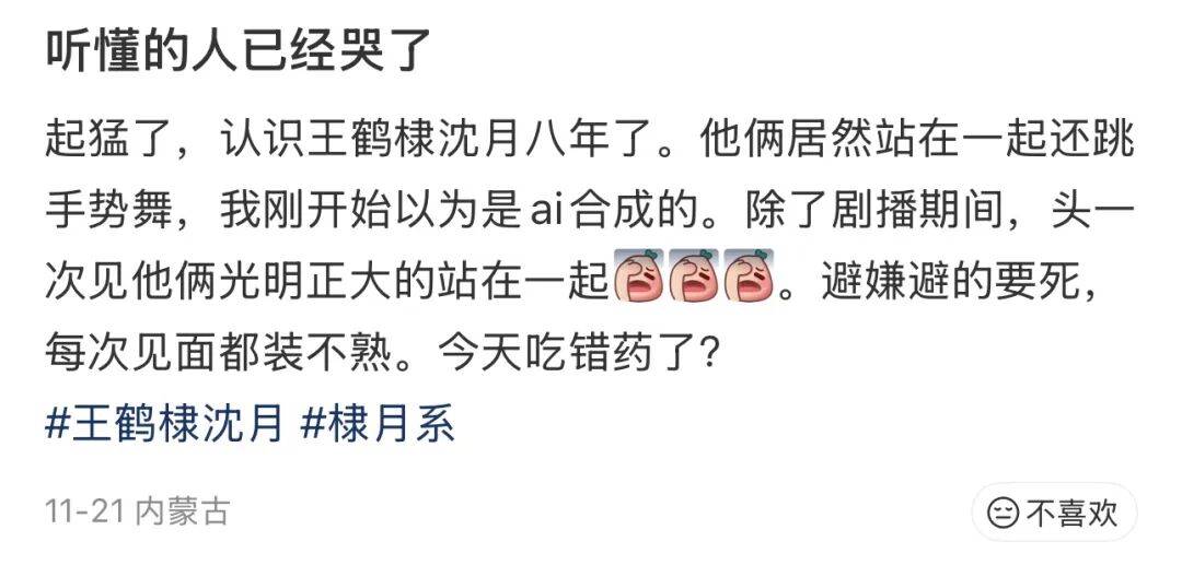 属实想不到,像王鹤棣和沈月这种敢打破“前同事”结界、高频同框发糖的,对比现在内娱剧cp一收官就急着解绑、装不熟的操作,已经算是活久见级别的稀有物了。