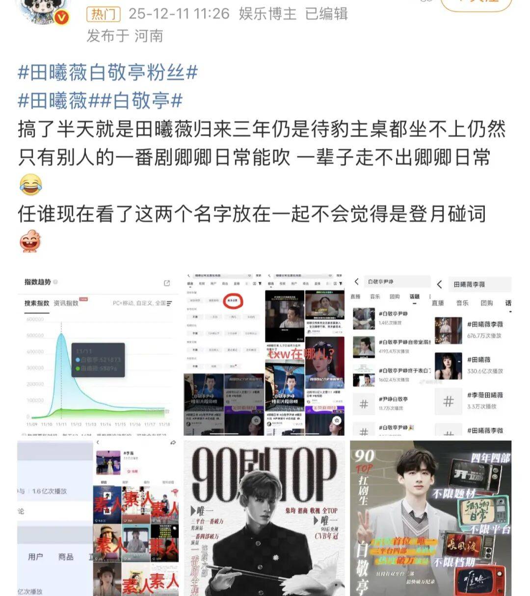 白敬亭粉丝甩出制片人“没有白敬亭就没有这部戏”的采访,硬刚田曦薇粉丝“抢扛剧功劳”,嘲讽女方一番剧播放量拿不出手。