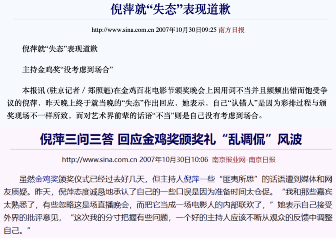 2007年金鸡奖主持中倪萍调侃没获奖的朱媛媛“还在那没心眼傻乐呢”,祝上了年纪的陆海空“永远不得老年痴呆”,被舆论骂到特意道歉,回应说考虑不周。