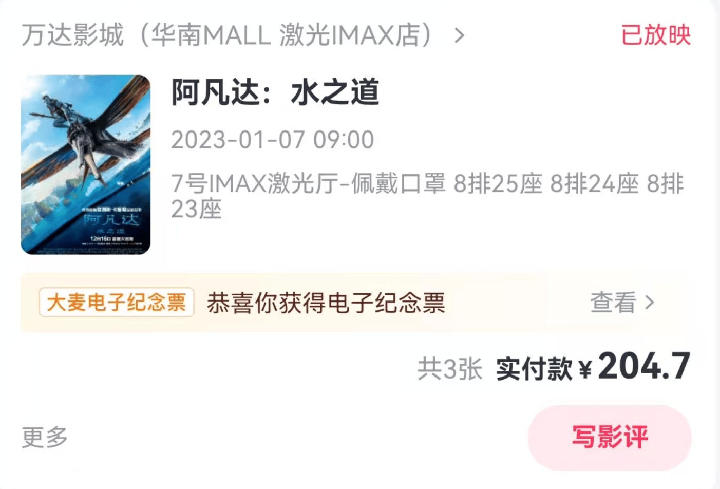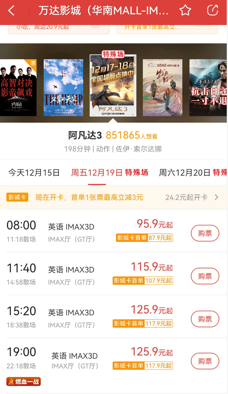 以当年《阿凡达》上映时影迷彻夜买票的东莞华南MALL万达为例,这家影院这些年已经成为很多影迷碰到大片就会去看的“胜地”,《阿凡达2》时我买了三张票,共花费204.7元,相当于每张票68元。到了《阿凡达3》,最早的8点钟场次价格就涨至95.9元,而和当时看第二部差不多的11:40场次,价格飙升至115.9元,涨价70%。