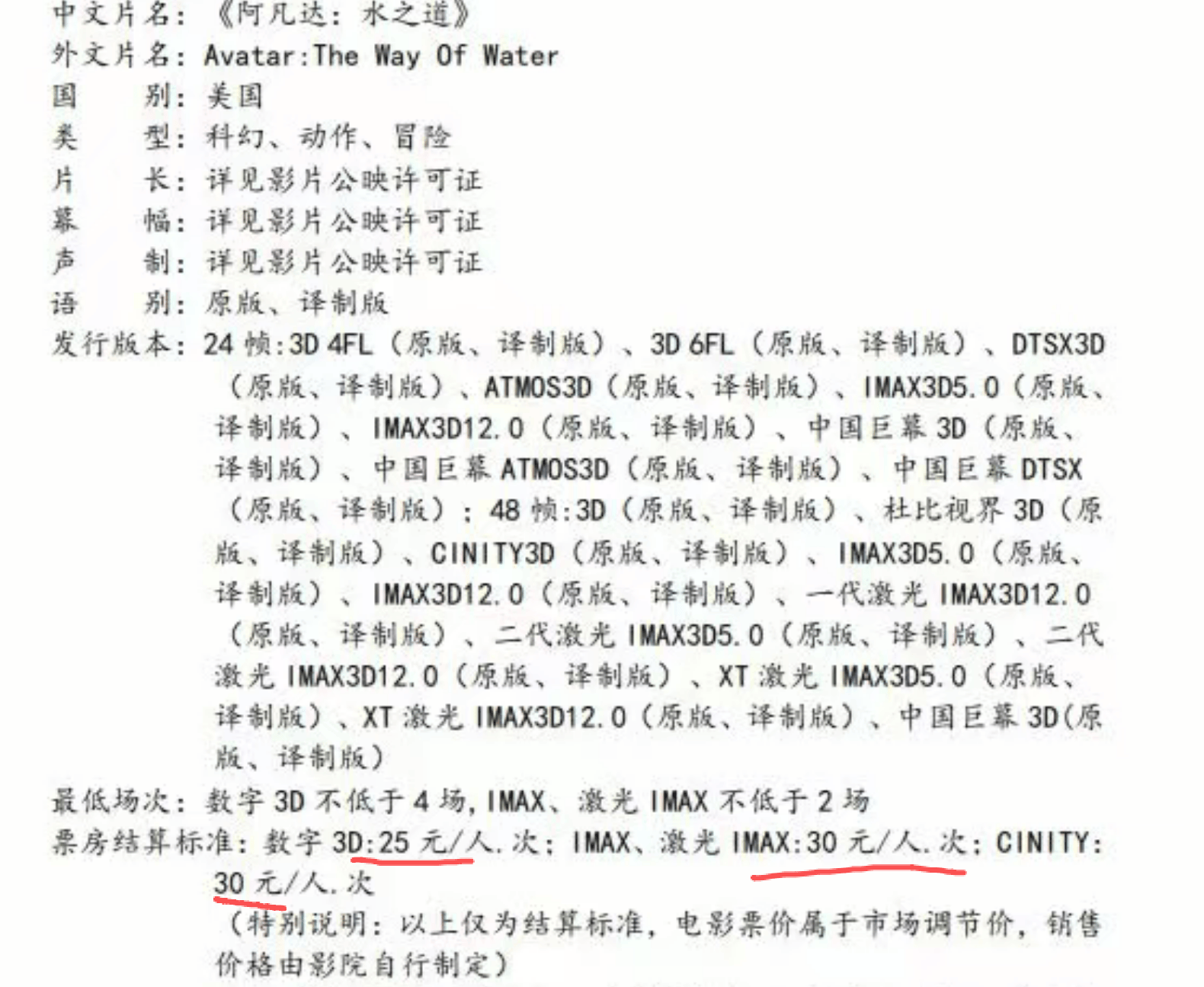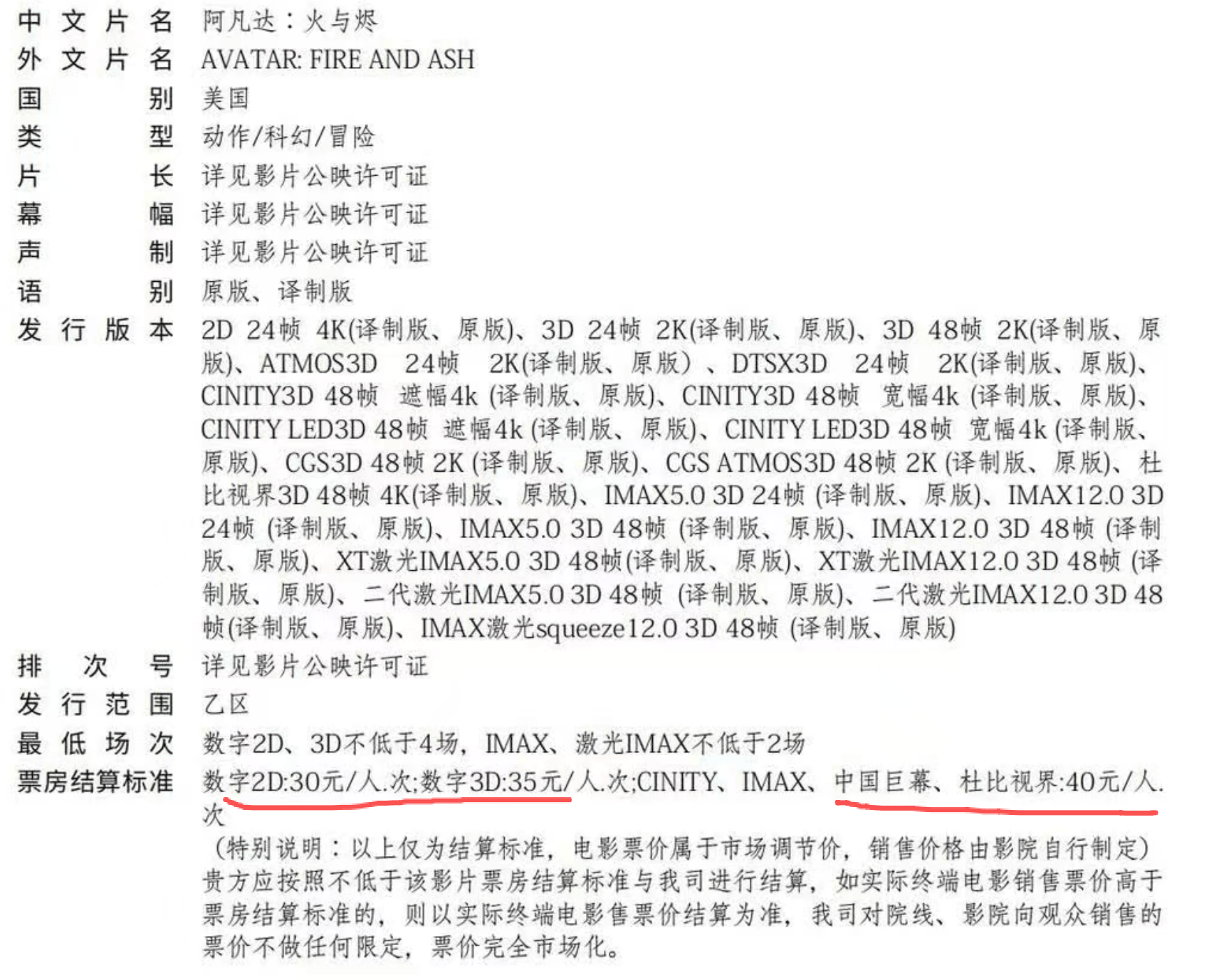 先看《阿凡达3》的发行通知,不分AB两类城市,全国统一普通版本的2D结算价30元,3D结算价35元,而IMAX、杜比影院等巨幕版本,则高达40元。
