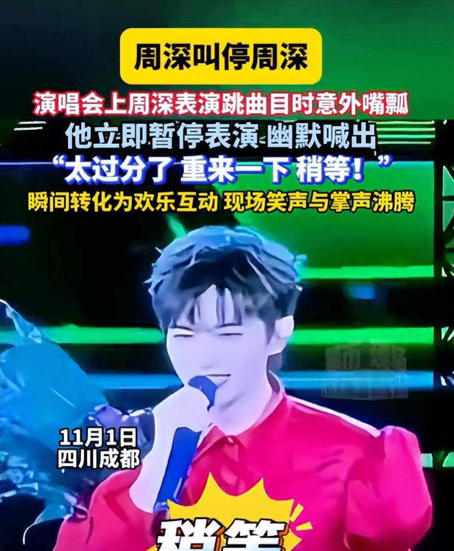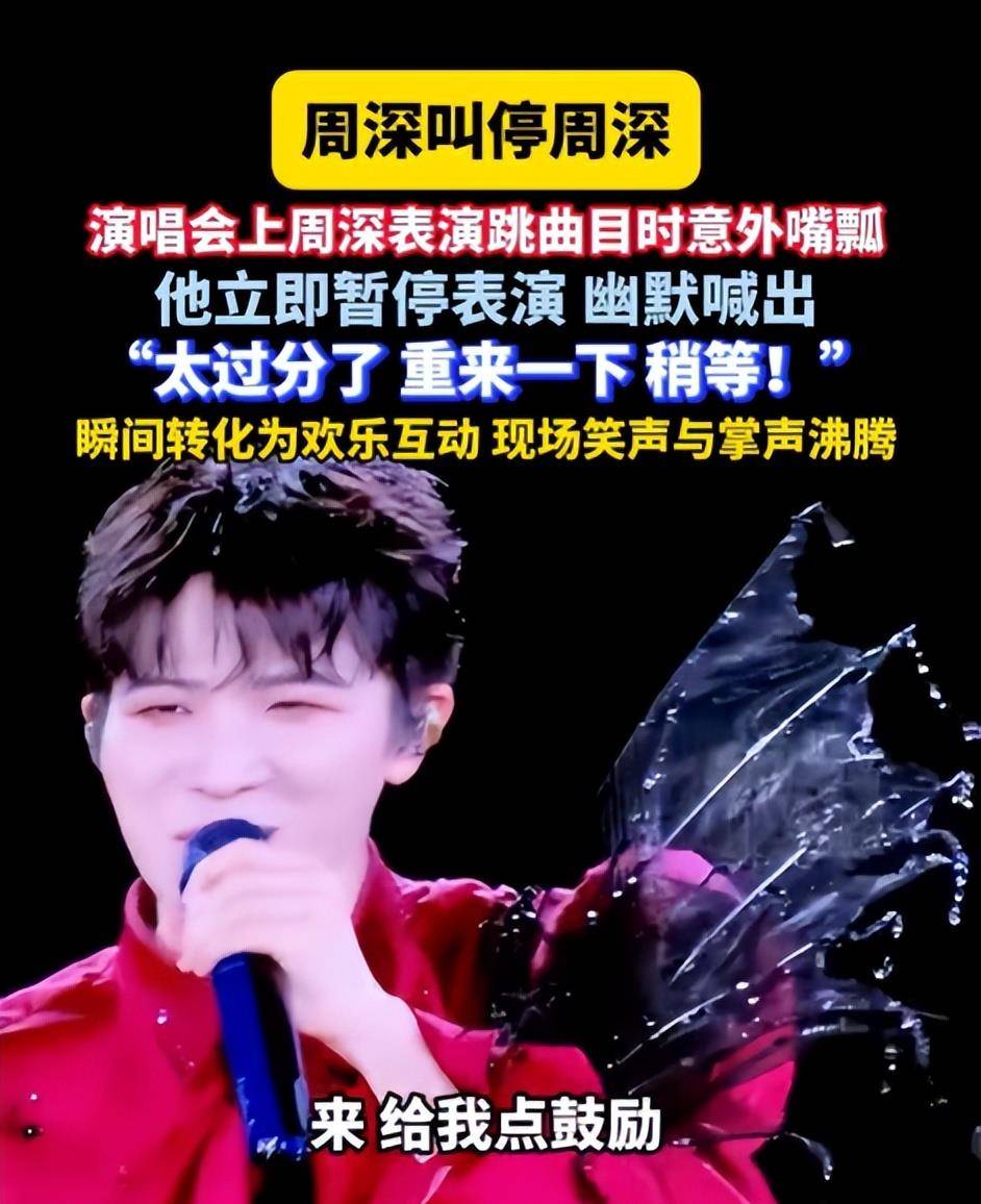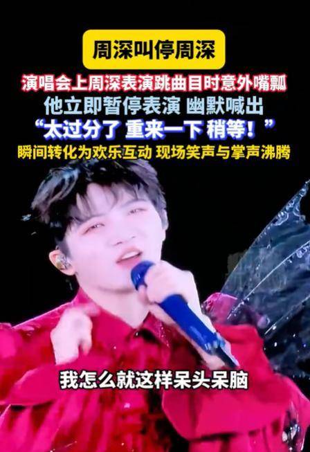 表演途中,一个不经意的“嘴瓢”悄然发生。他瞬间察觉,随即自然地停下,带着俏皮的笑意对着观众说:“太过分了,重来一下,稍等!”