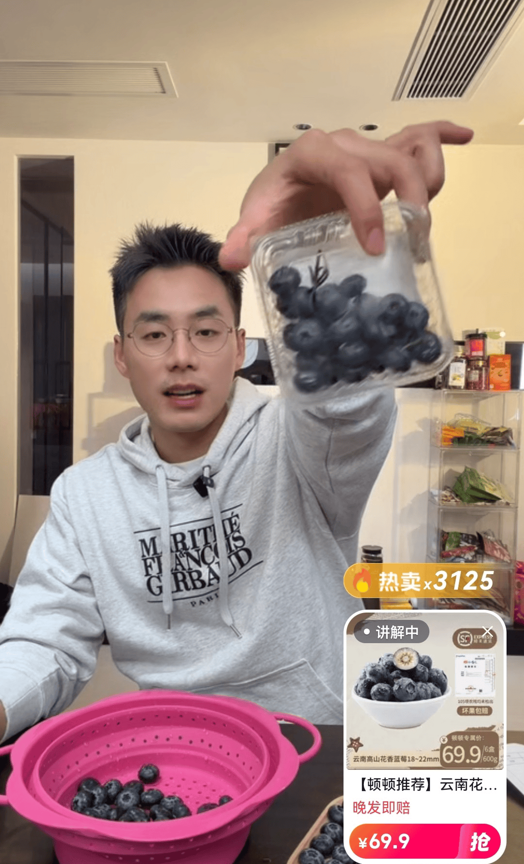 12月17日,顿顿在直播卖蓝莓,直播间才7000多人,他很卖力,不时穿插着英语教学,加上大幅度的手部动作。