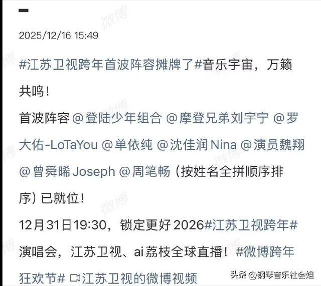 三大卫视纷纷官宣跨年演唱会阵容。江苏卫视抢先一步,公布了8组嘉宾名单,其中既有演艺前辈,也有知名演员,更不乏实力唱将。