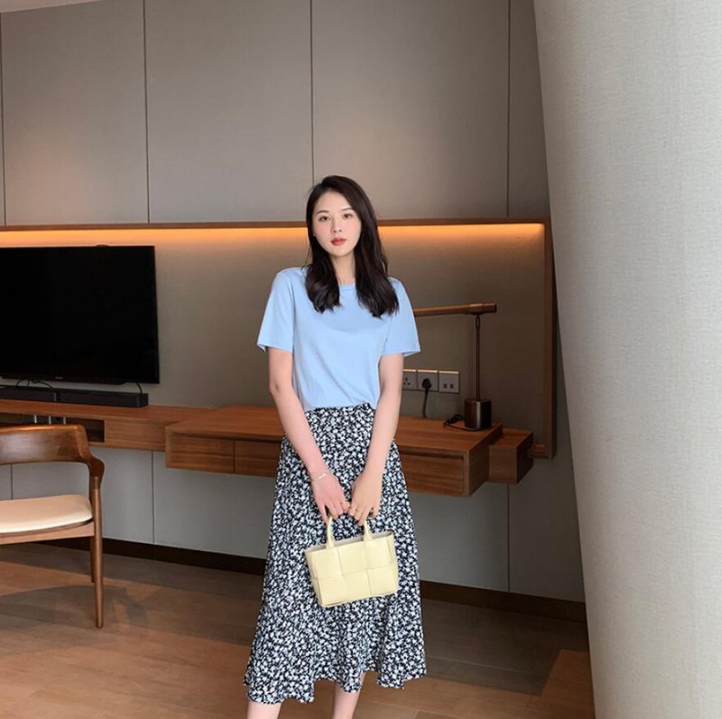 浅蓝色T恤是很好搭配衣服的,穿出来也很显清新感,搭配各种颜色的碎花半身裙都很优雅、大方。
