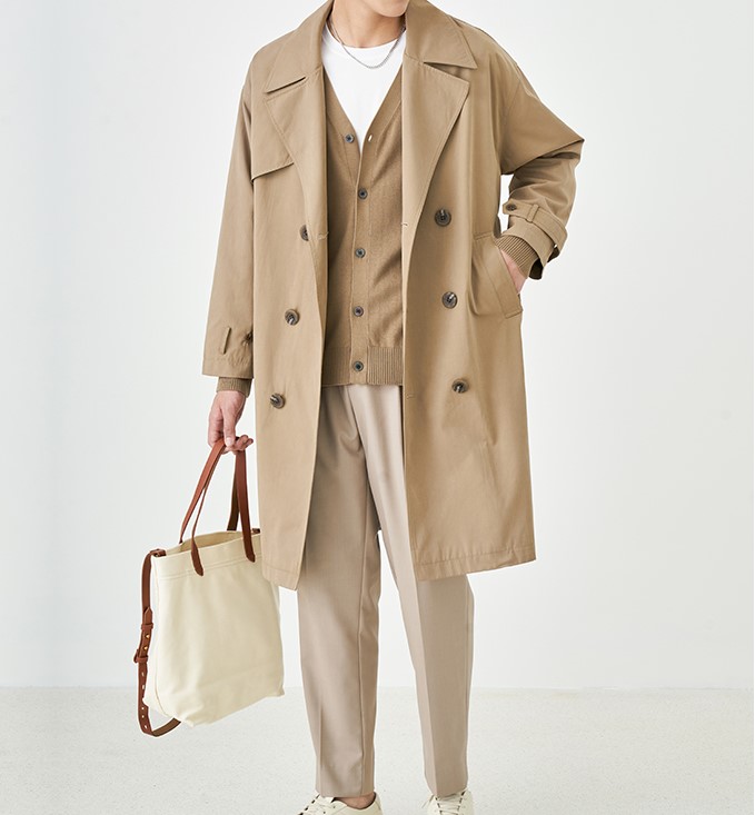 大衣都是稍微比较长的,所以要看看自己的身高高不高,如果是很高的男生就要选择过膝盖的大衣一摆长度,如果是矮个子男生就要穿膝盖以上衣摆长度,这样才可以扬长避短显得个子高。