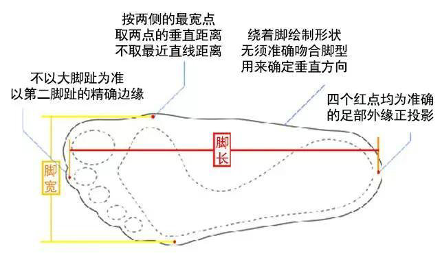 如图所示用笔在脚的最顶端和最底部以及脚最宽的地方画上直线,然后再用卷尺进行测量。