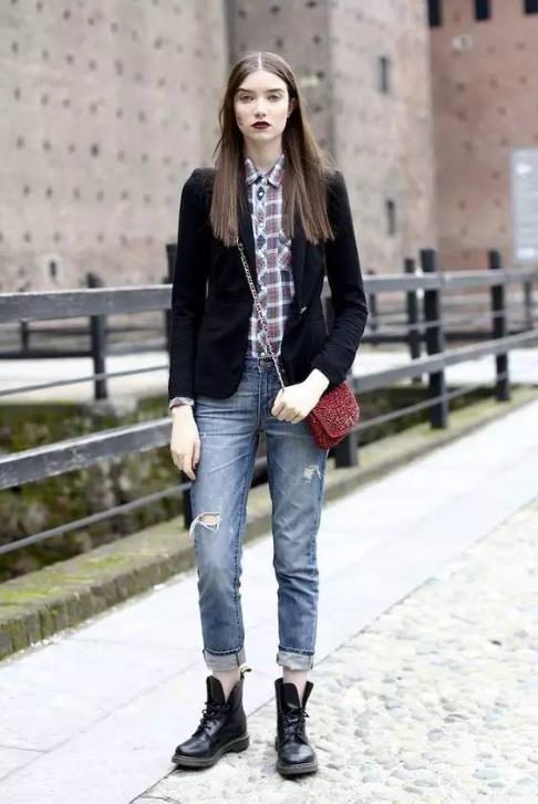 牛仔裤是一年四季都可以穿的,有帅气,也有个性范儿,流苏款的牛仔裤配黑色的马丁靴,造型瞬间就很潮,也很有范儿,一整套的牛仔look,冬天要耍帅就这样穿。拼接款的牛仔裤配马丁靴,就多几分痞痞的酷帅feel~