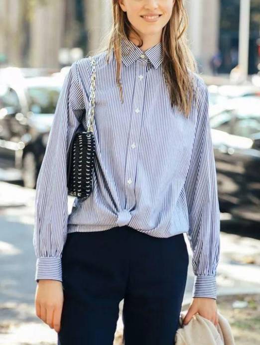 有些菇凉会把衬衫反着穿,那么这时候打个结也很不错。