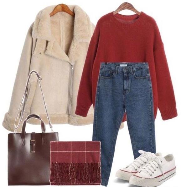 2.红色毛衣配白色外套