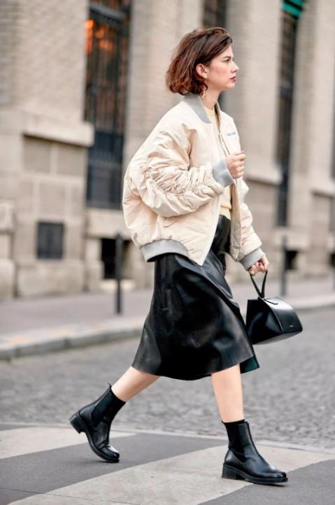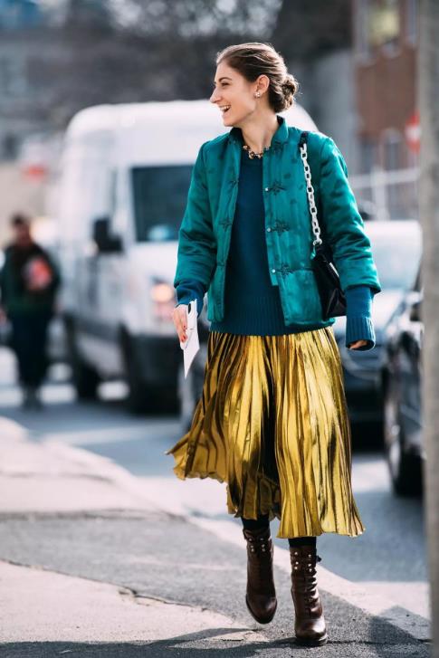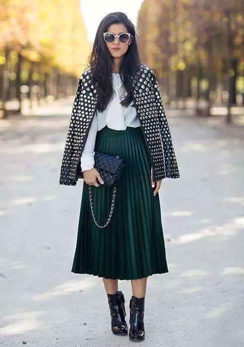 2. 时尚潮流风格 偏爱时尚潮流风格的女性朋友对冬季半身长裙是很有诱惑力的,百褶半身裙在搭配上时尚的外套,时尚之余不失甜美清新感,再里面搭配好看袖衬衫和丝袜,提升整个造型的时尚亮度,最后一对好看的高跟鞋更是养眼。