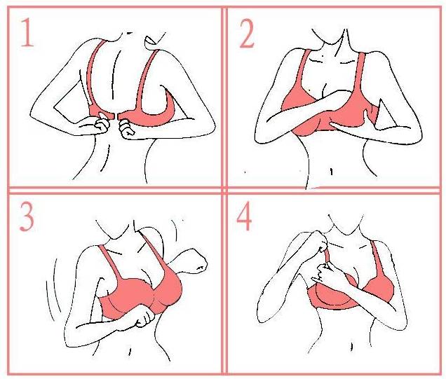 把罩杯扣在胸前,将搭扣扣好后再转到去,然后跨上肩带,再将副乳收进罩杯里,最后调整肩带。
