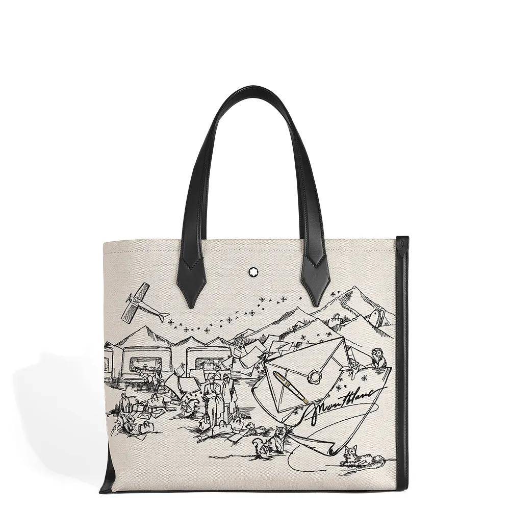 万宝龙节日胶囊系列皮具作品包含一款托特包、一款迷你相机包和一款手袋,极具现代感的精美黑色刺绣在象牙白色帆布背景上勾勒出一幅梦幻温馨的图景,饰以黑色皮革配件作为细节点缀,不仅赋予了设计层次感,更添一份百变随行的摩登气质。