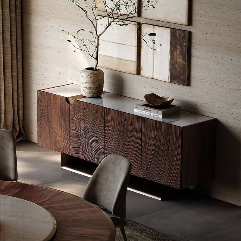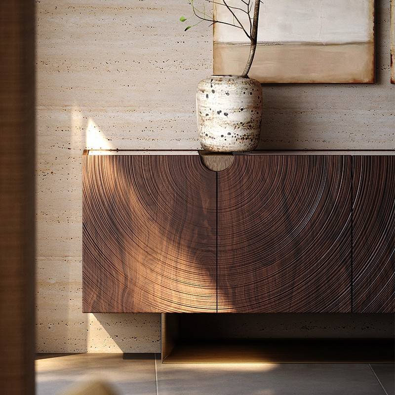 优选材质保障: 柜门采用北美黑胡桃木实木雕刻,精准规避了薄板的轻飘感与过厚木材易开裂的风险,确保了产品的耐久性与视觉的厚重感。