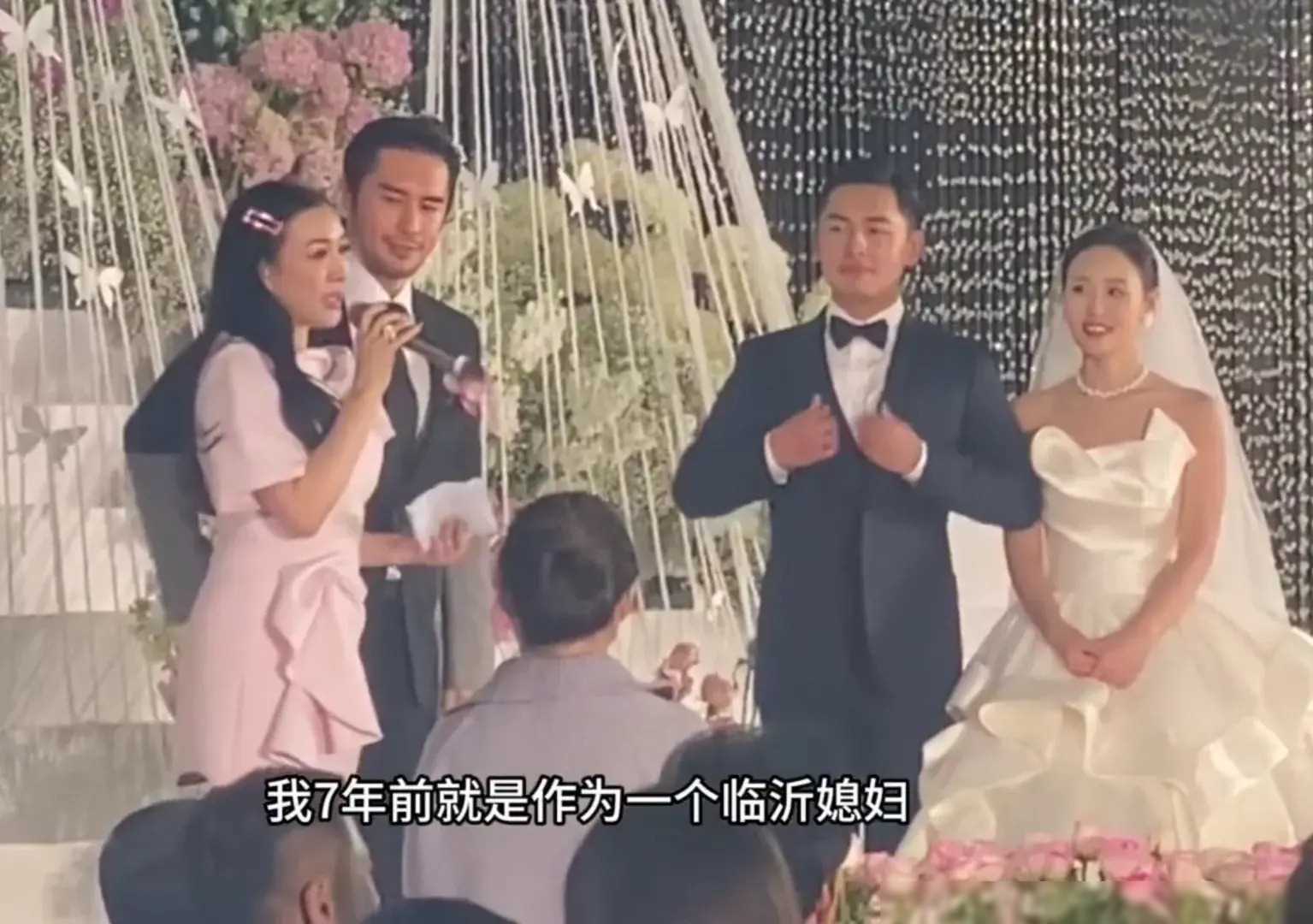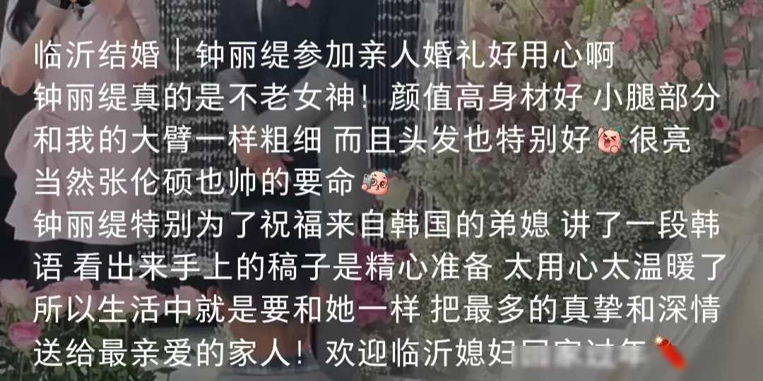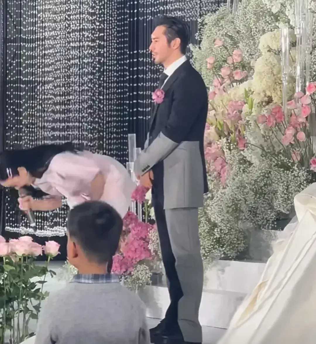 令人惊喜的是,婚礼现场传来了新娘是韩国人的消息。钟丽缇在祝福新人时展现了她的多语才华,用流利的韩语表达了深情祝福之情。这份亲切和热情也体现在她对新人和宾客们的鞠躬致谢,一点明星架子都未曾露出。