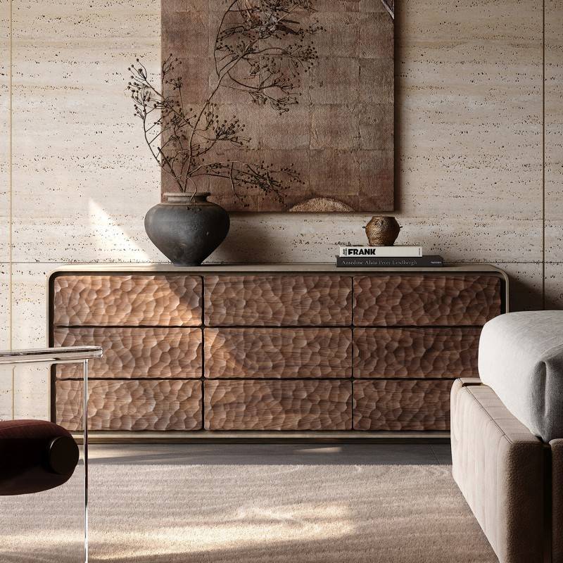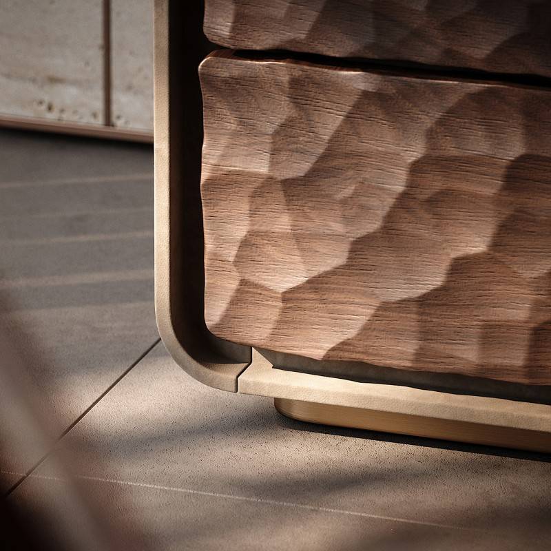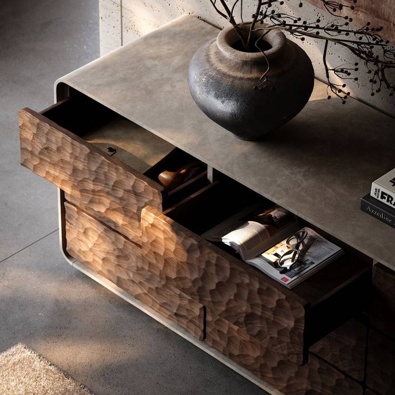 VISN「玲珑艺术雕刻柜」将金属锻造中的锤击肌理,巧妙转化为木器上的手作雕刻,在凹凸之间,为您的空间注入独特的现代肌理。