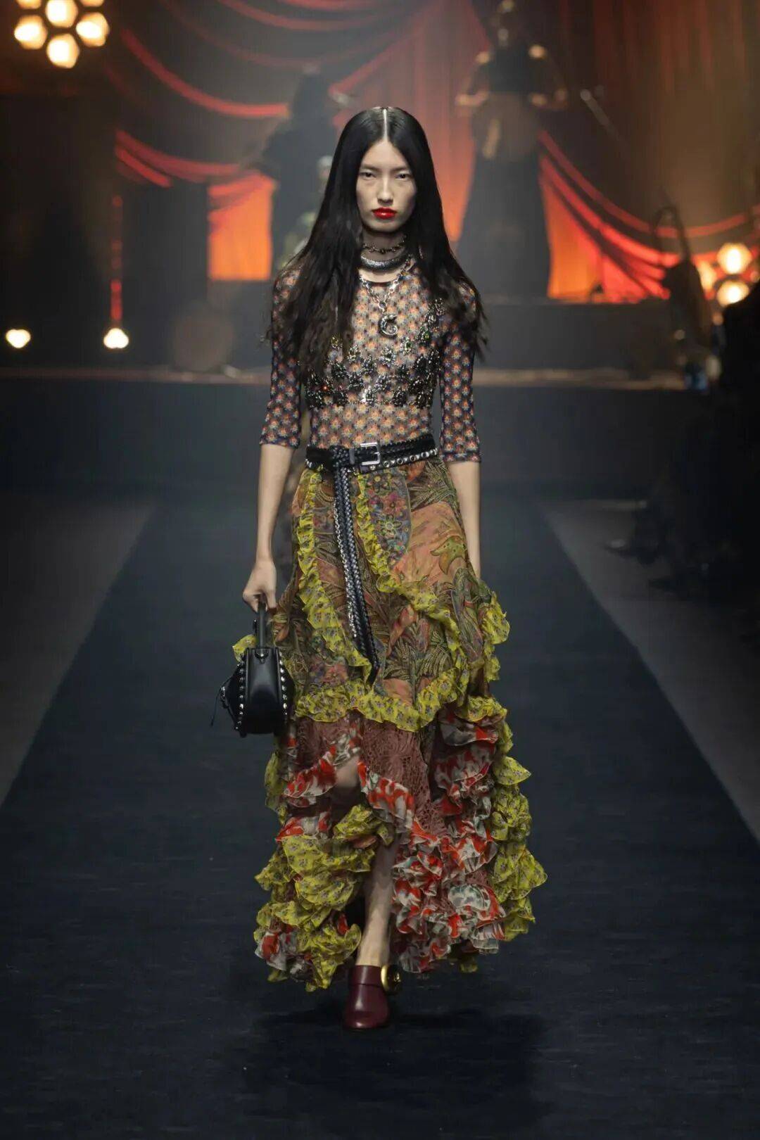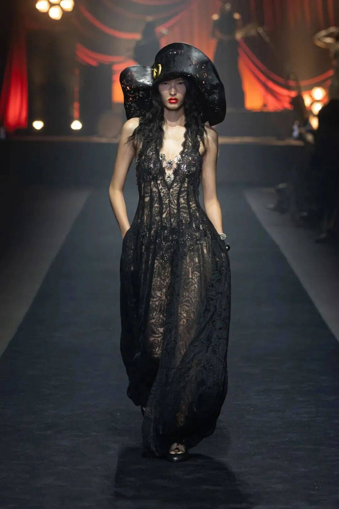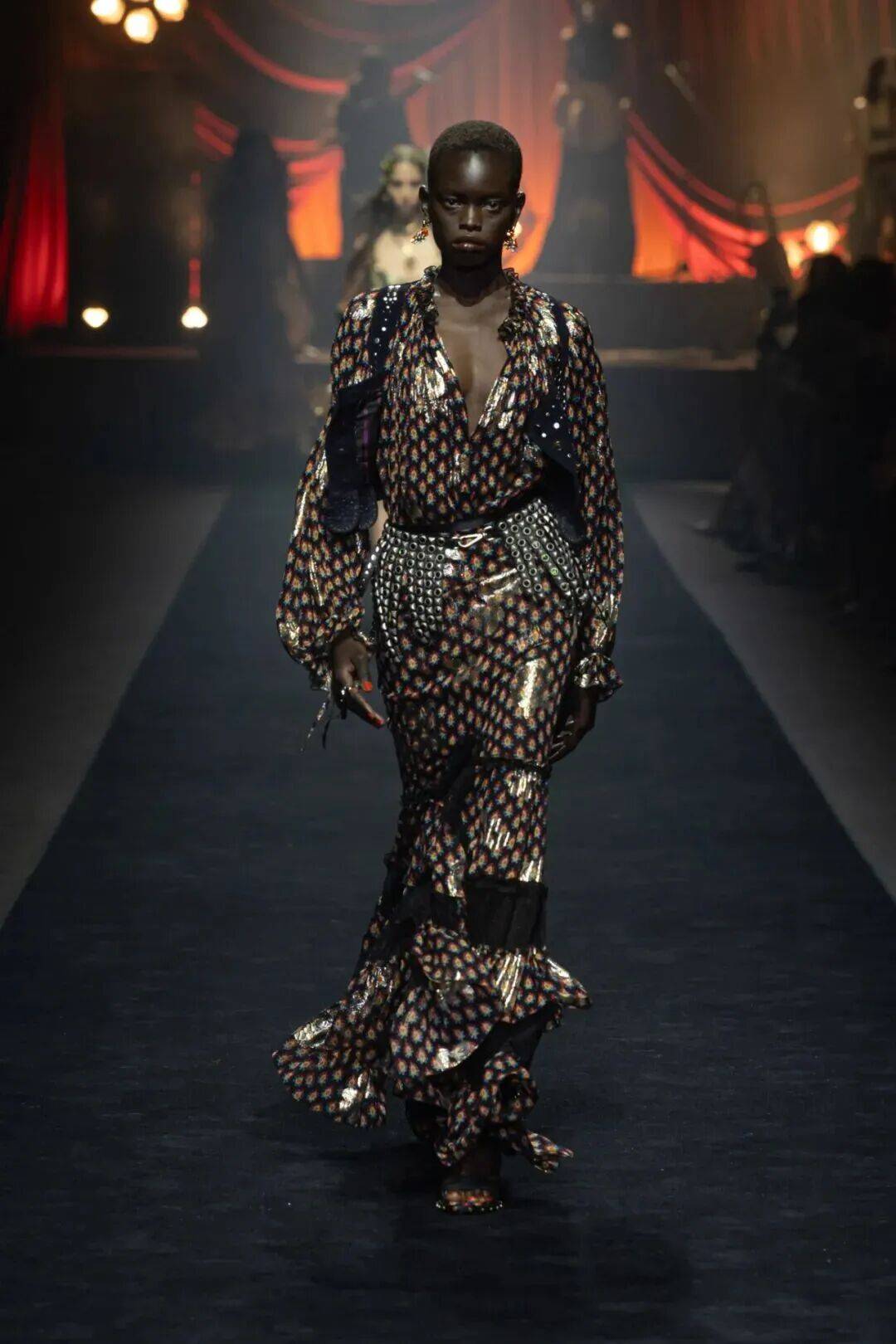 系列中,荷叶边、流苏与丝缎光泽被注入灵动气息,钩织与透视设计则巧妙勾勒出肌肤的柔美轮廓。流苏在夹克上飘扬,刺绣花朵在裙摆上绽放,层叠的礼服仿佛是为了捕捉音乐和动感而设计。
