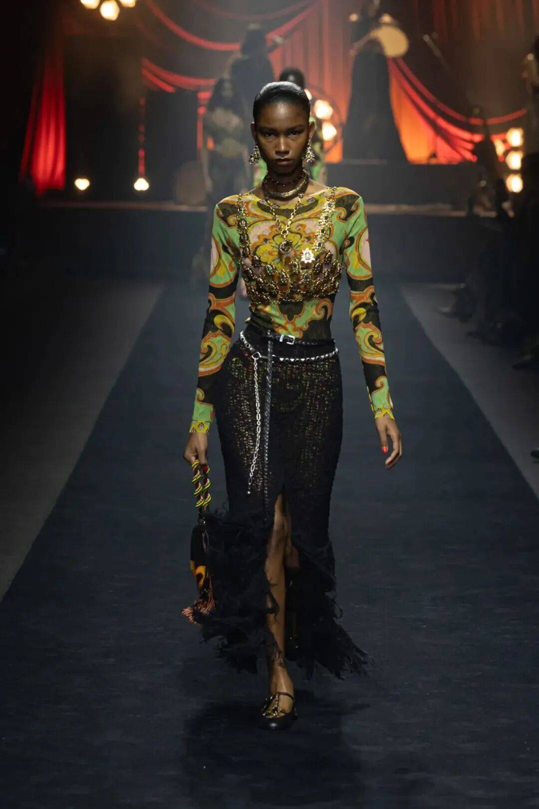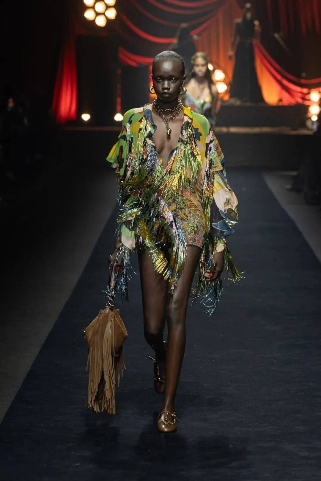 在当下这个推崇“少即是多”的时尚季,德·文森佐反其道而行之,以近乎反抗的姿态拥抱极繁主义。他将流苏、金属铆钉、褶边、玻璃珠饰以及大量品牌标志性印花和金属提花织物融为一体,构建出一幅令人目不暇接的视觉画卷。