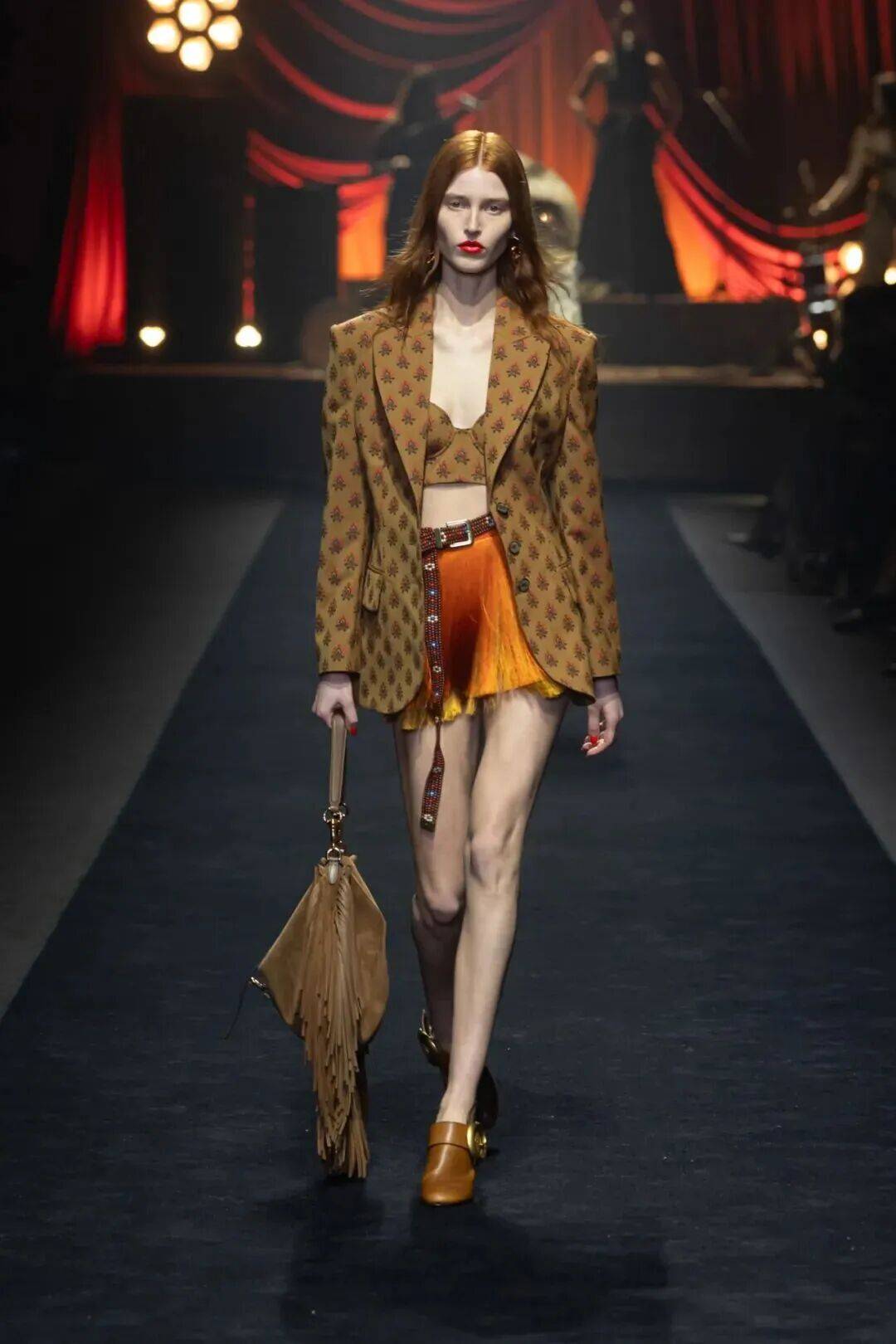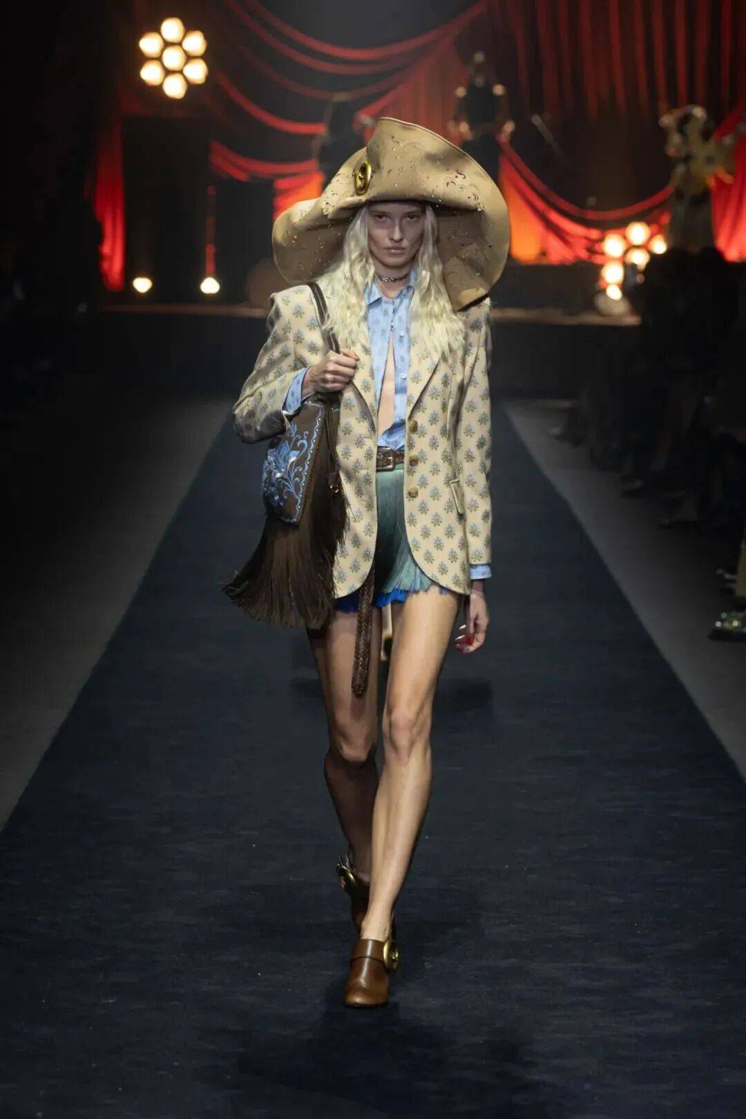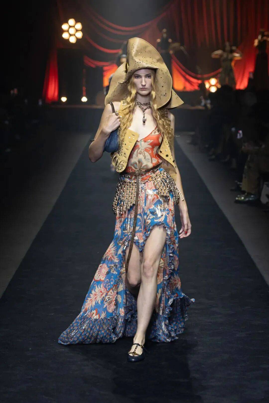 皮质手袋点缀刺绣与流苏,激光切割的皮革宽檐帽饰以镂空花卉雕饰,成为整体造型中的流动焦点。超大耳环、串珠腰带以及撞色图案围巾,所有这些都增添了夸张的韵律。