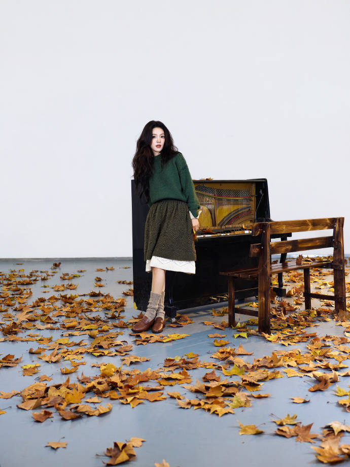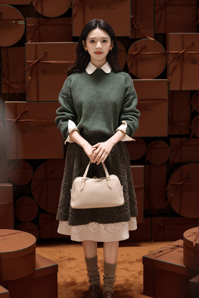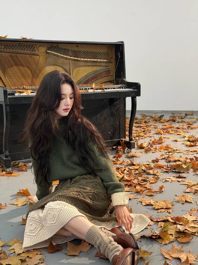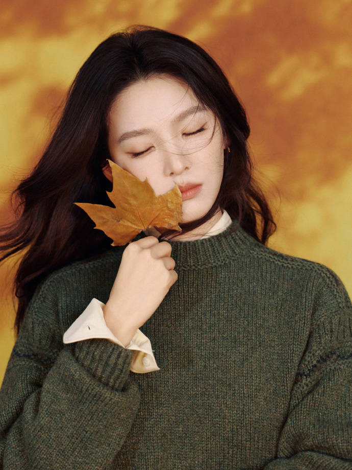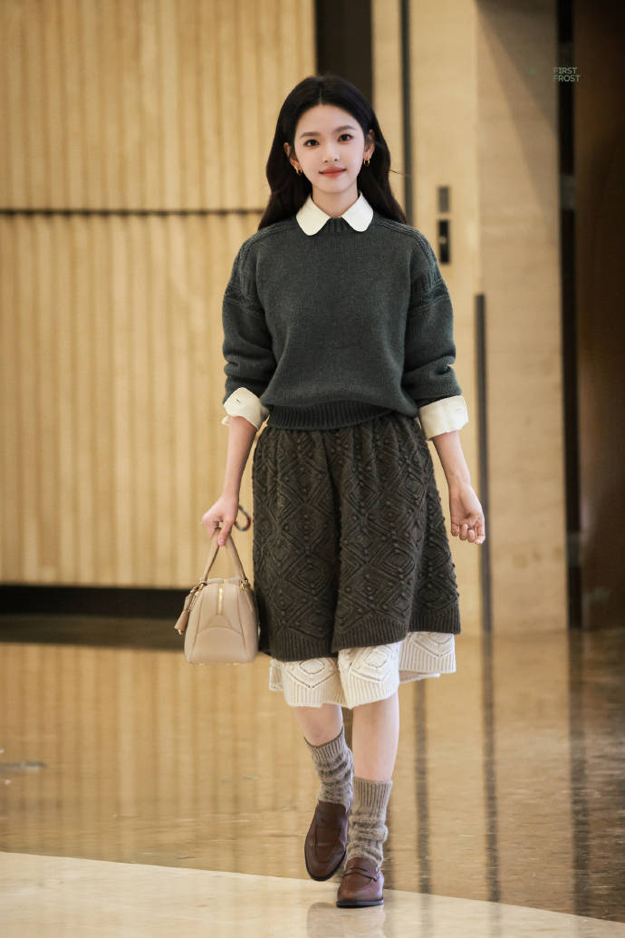 深绿色针织毛衣搭配棕色针织半裙,章若楠的这款穿搭充分展现了深秋浓郁的氛围感和满满的治愈气息,同时在细节处理和色彩搭配上也体现了她独特的时尚品味,堪称“老钱风”单品穿出的俏皮感。