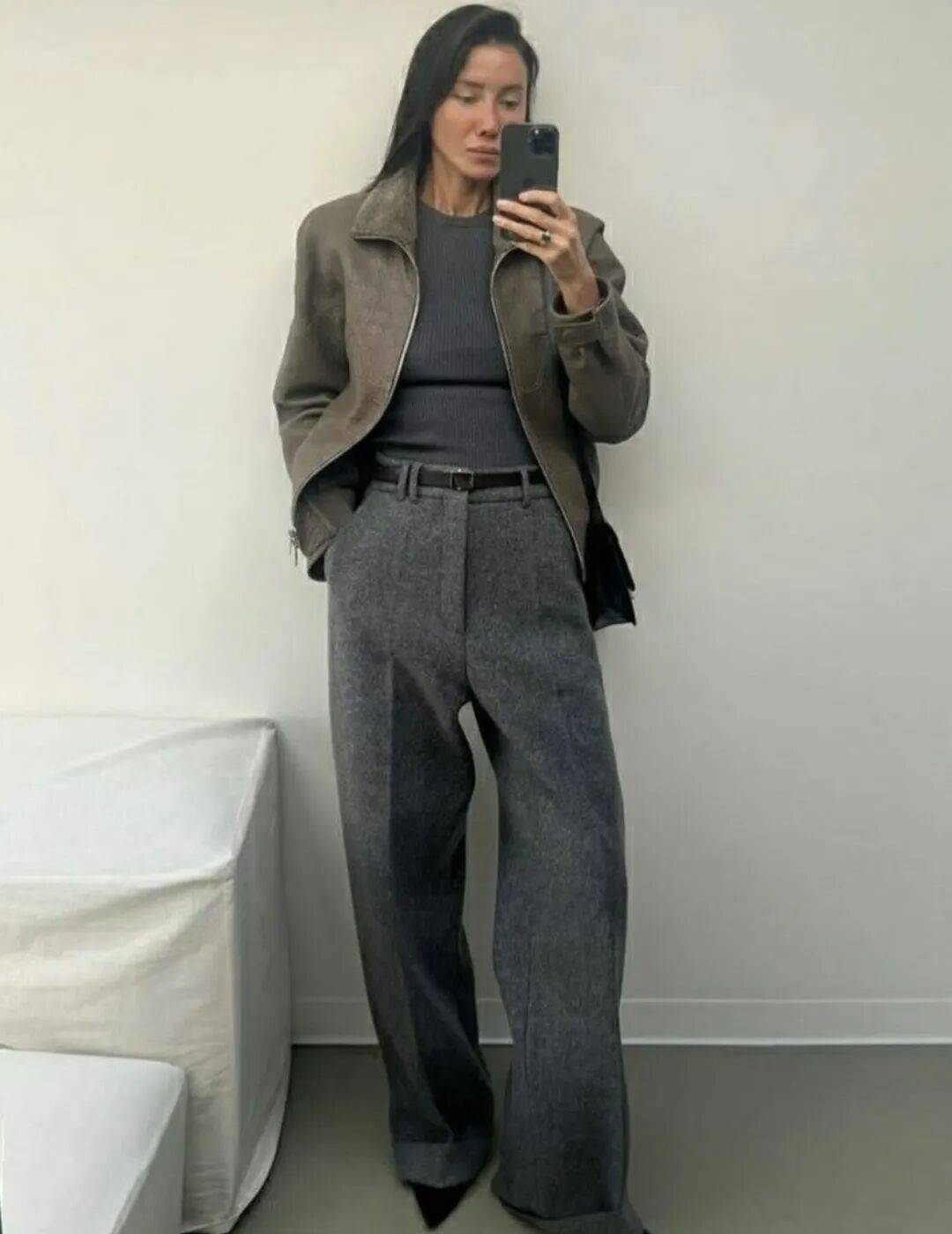 羊毛、丝毛混纺等面料能提升高级感。灰色系是新高智风的王牌色彩,从石墨灰到浅灰,都极具理性魅力。