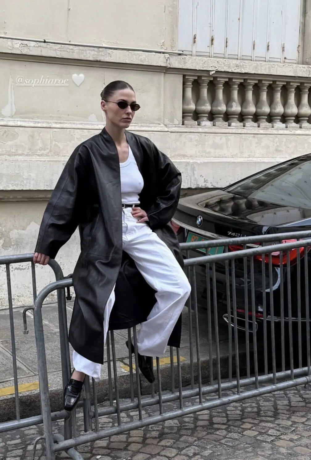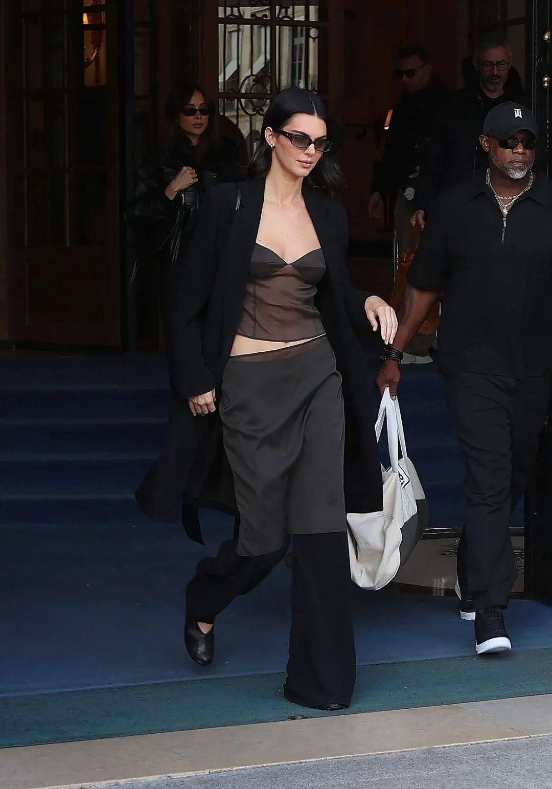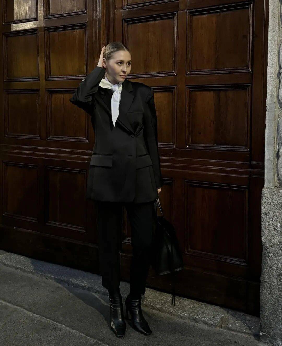 ennie 这一身堪称模板: oversized 灰衬衫搭配飘带与黑色短靴,刚柔并济,都市感十足。而 Kendall 则以廓形外套内搭透视裙装,完美平衡性感与理性。