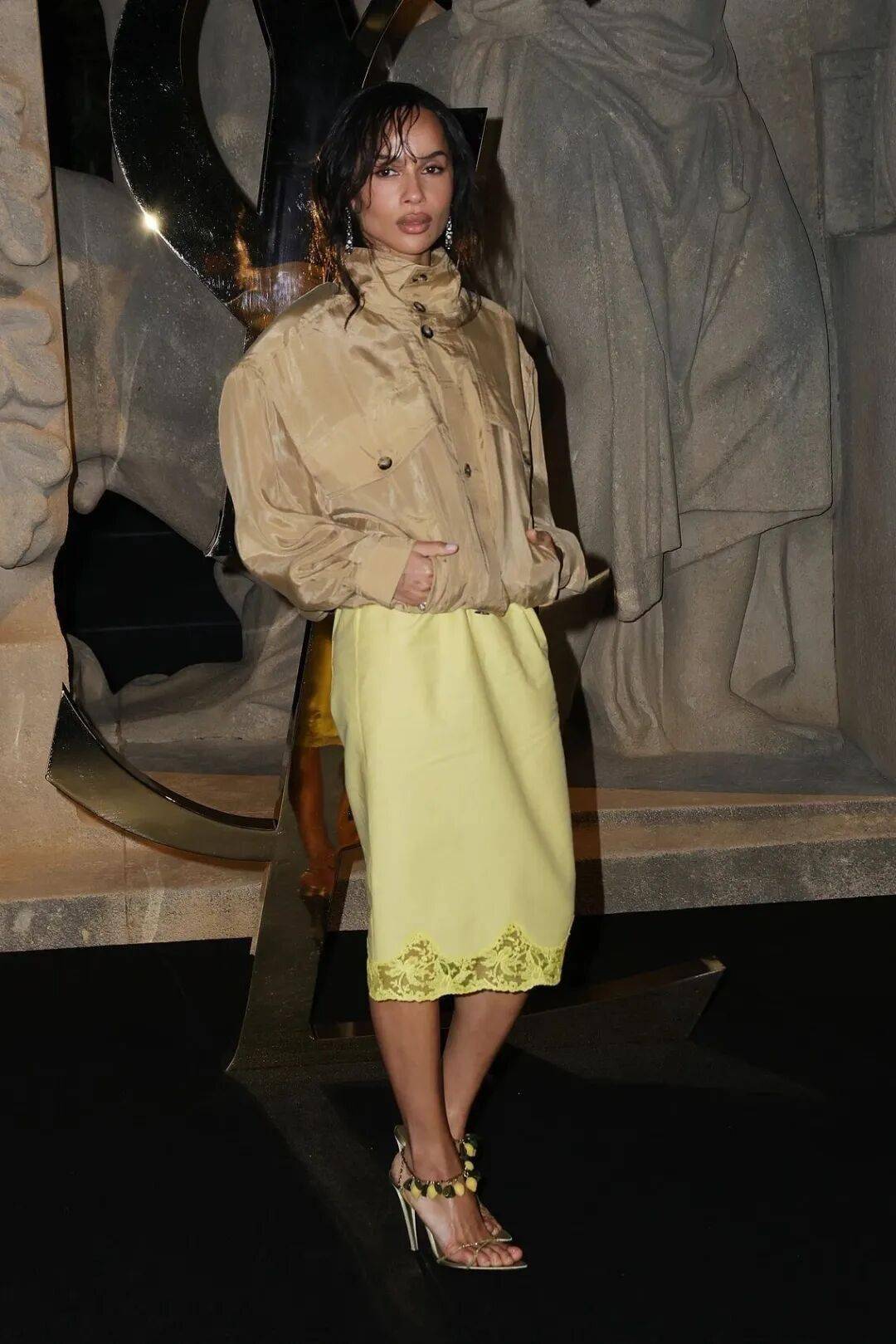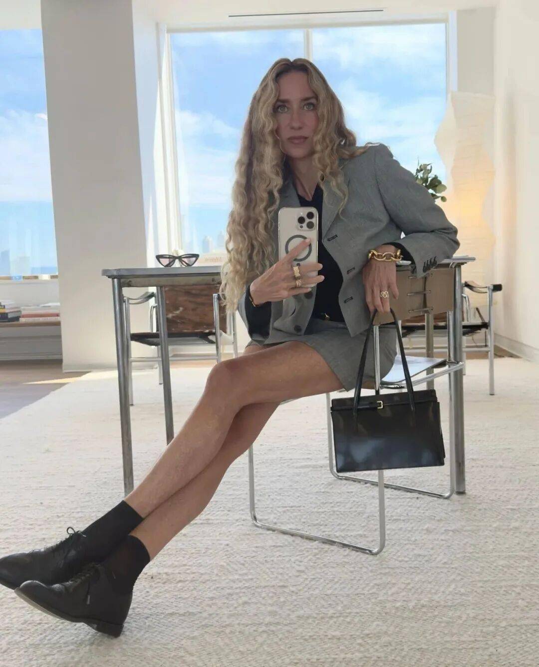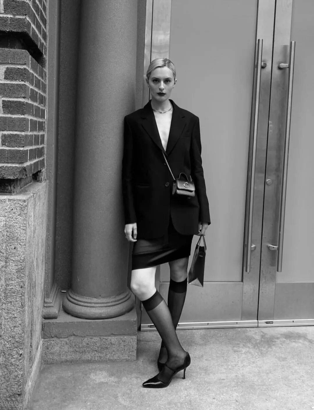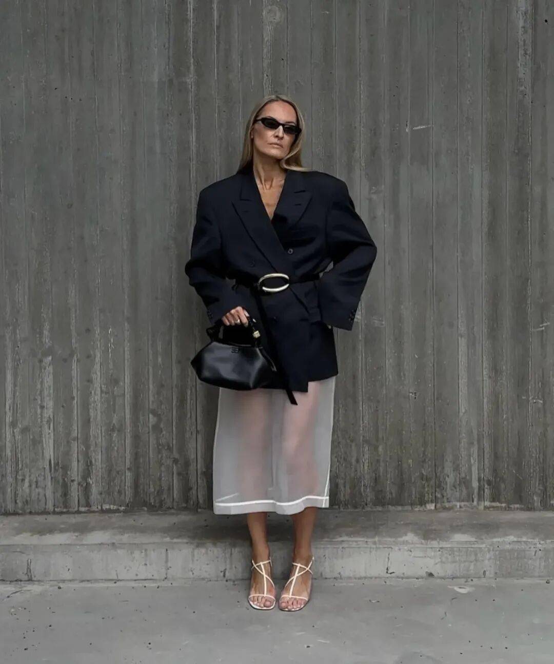 ennie 这一身堪称模板: oversized 灰衬衫搭配飘带与黑色短靴,刚柔并济,都市感十足。而 Kendall 则以廓形外套内搭透视裙装,完美平衡性感与理性。