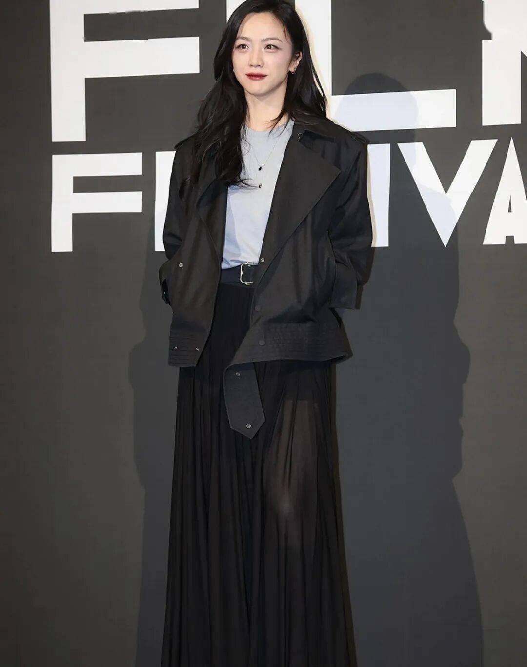 除了舒淇,汤唯出席电影节也是这种穿法,中性廓形上衣搭透视长裙,熟女的高智感扑面而来。