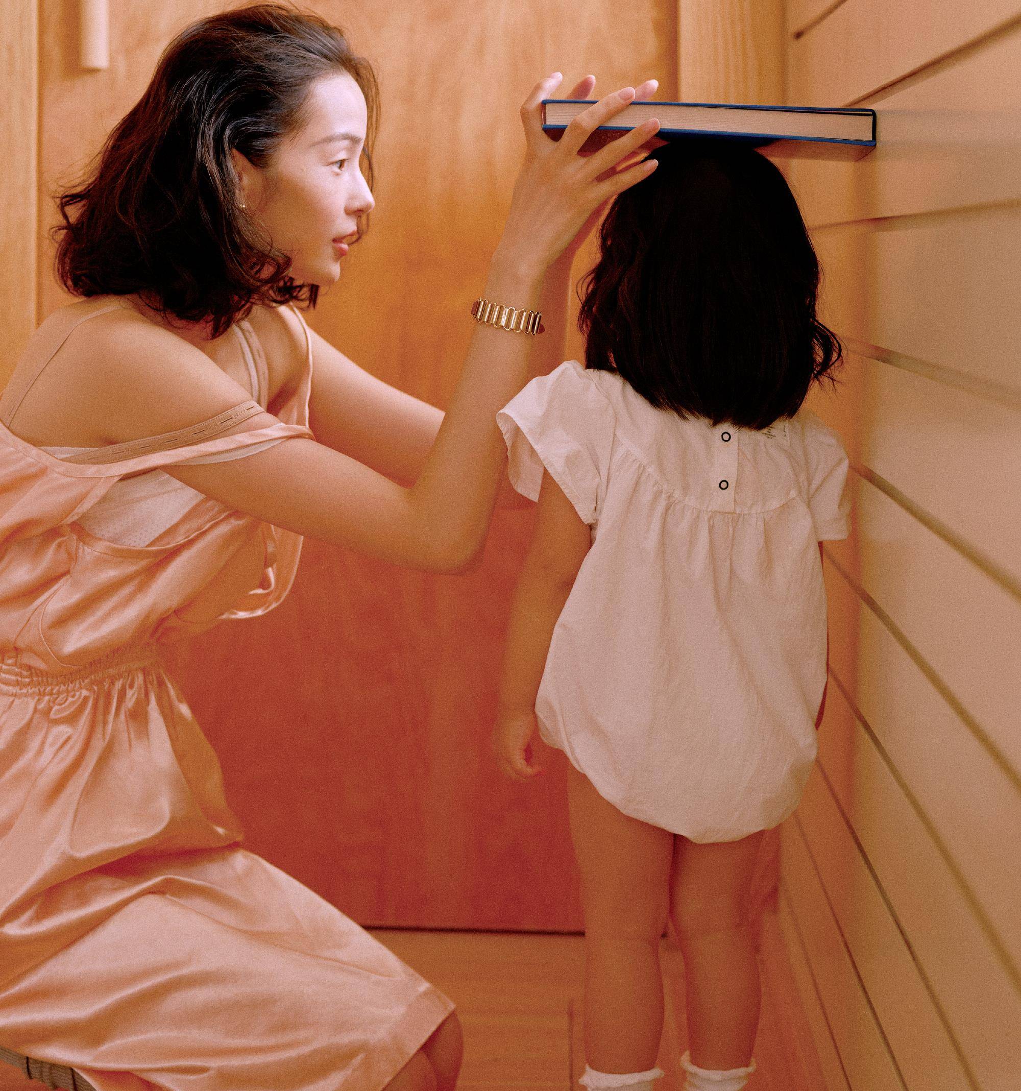 作为母亲,雎晓雯总是以平等的视角与女儿交流。孩子对她十分依恋,拍摄时,小水草自然地坐在地上,捧起妈妈的脸亲吻,画面温暖动人。