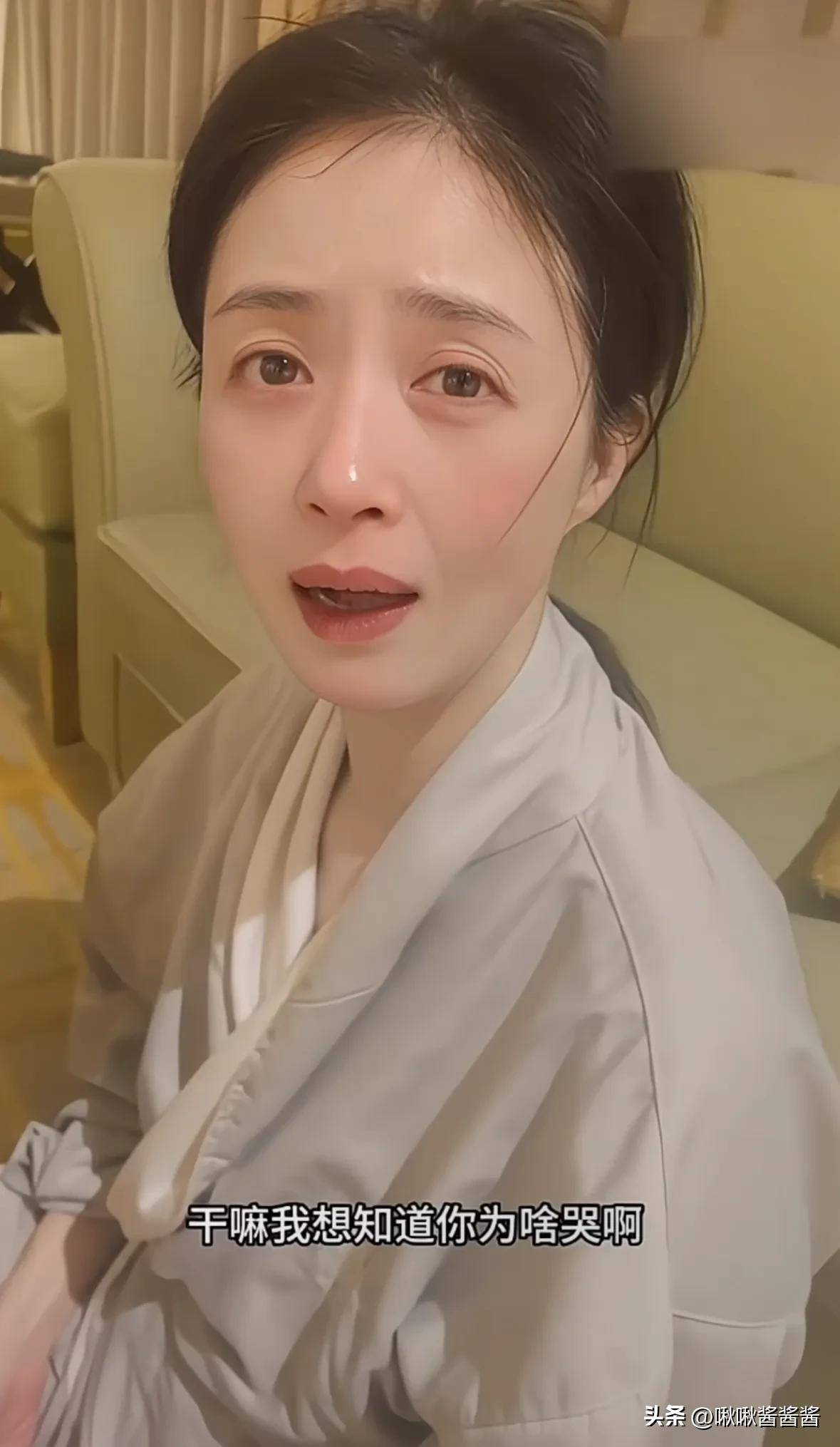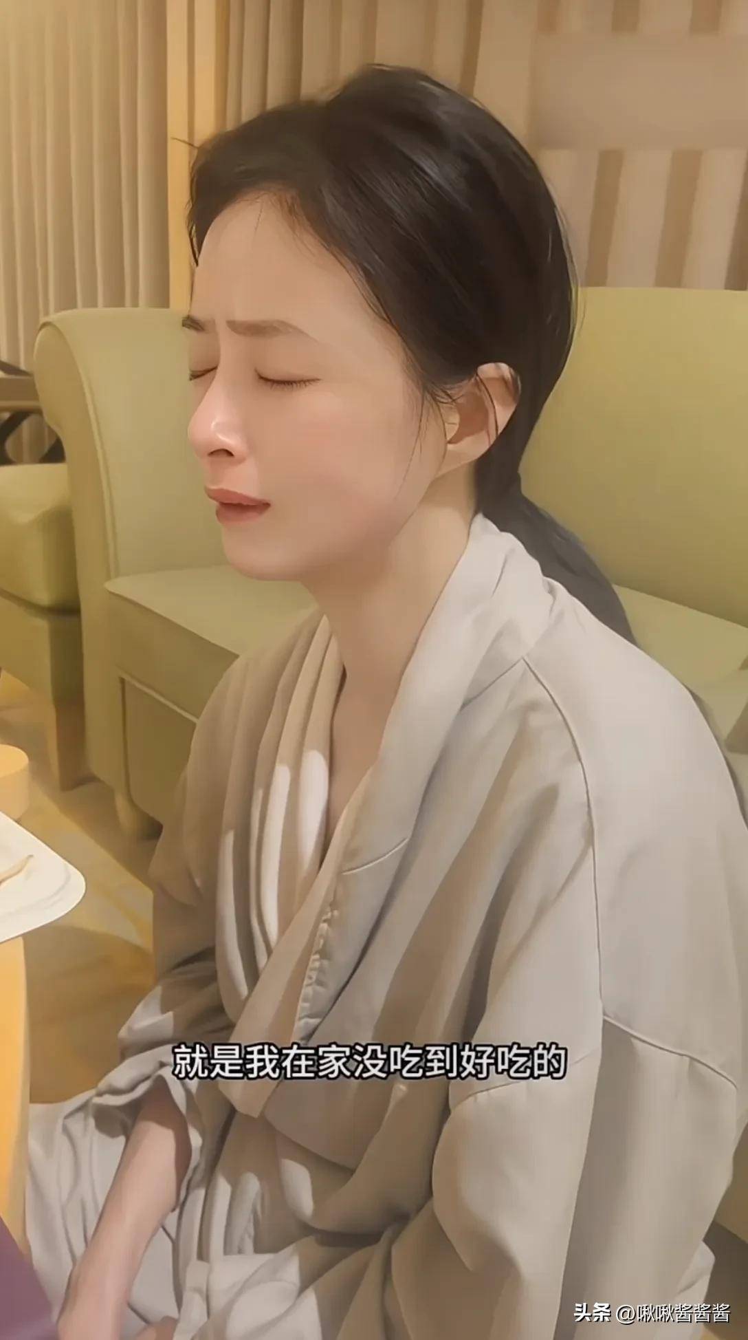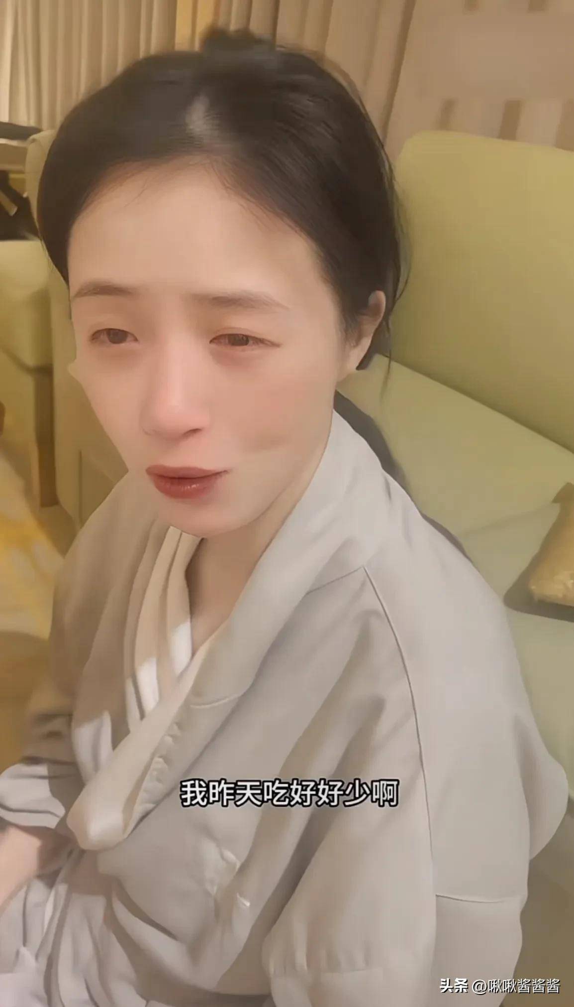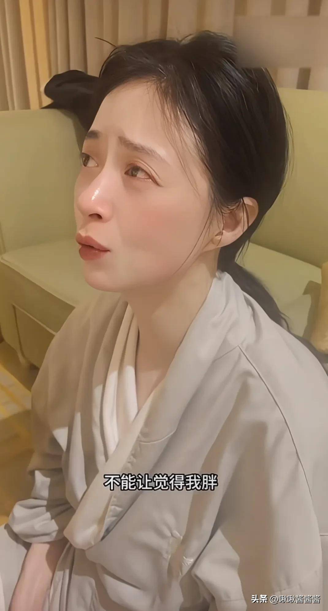 镜头中的蒋欣双眼红肿,时不时擦去泪水。她的发型凌乱,皮肤依旧白皙透亮,但面容却因过度减肥显得有些消瘦,尤其是那双眼睛,眼皮下垂,整个人看起来颓废、没有生气。