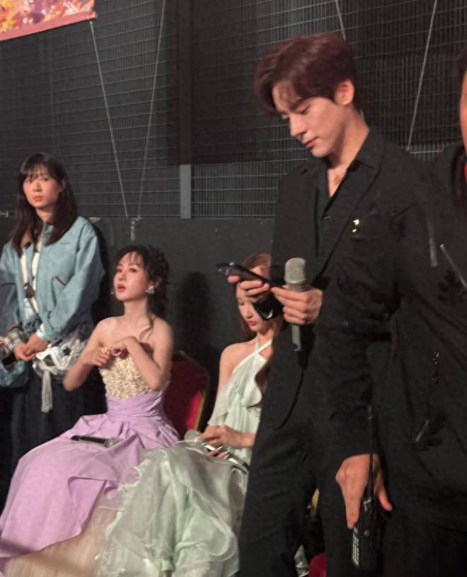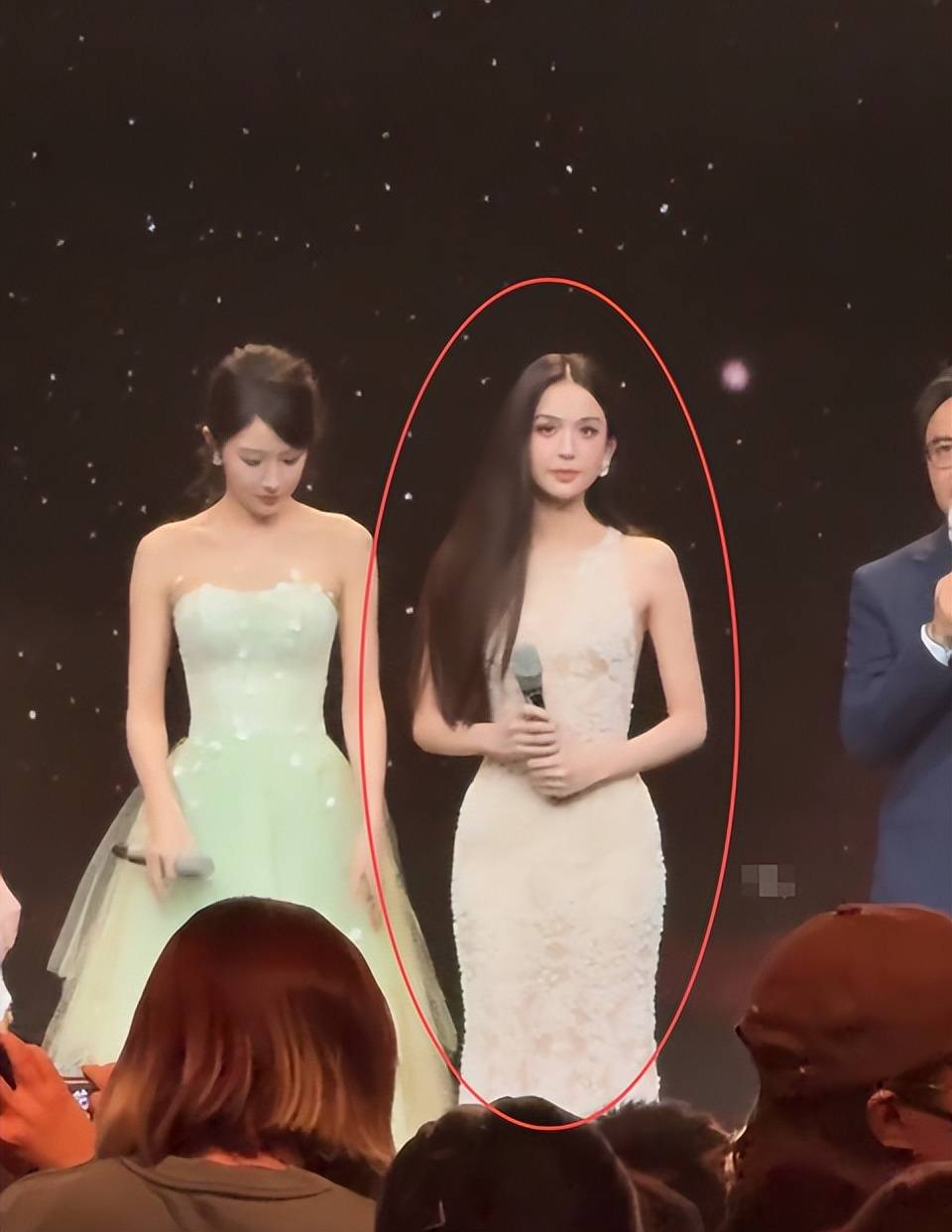 蒋欣穿着一袭粉色长裙站在台上,光线打在她身上,她的皮肤白得像是透光一样。她的脸小巧精致,身材修长纤细,腿又长又直。可惜的是,这条裙子并没有很好地展现出她的好身材,反倒让她看起来像是个“水桶腰”。不过,蒋欣依然是人群中的焦点,毕竟她的气质和形象实在太令人注目。