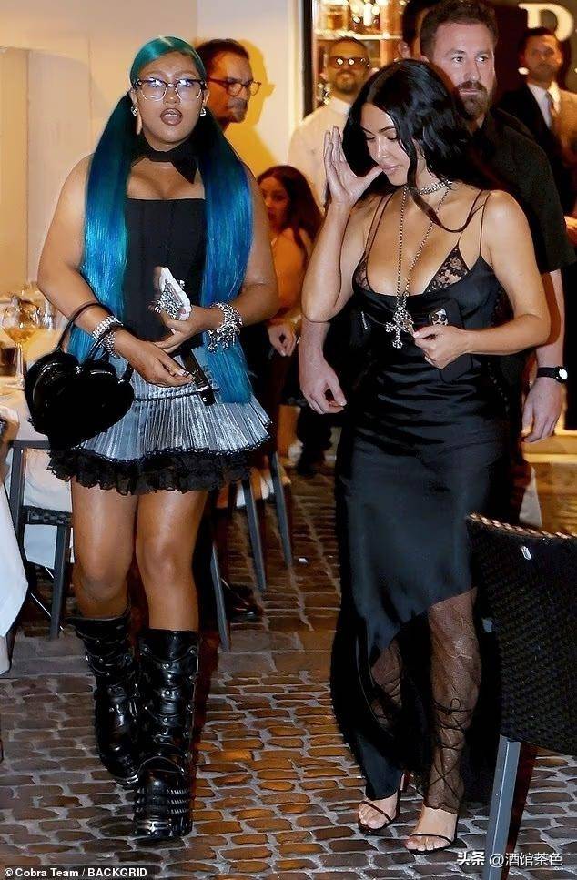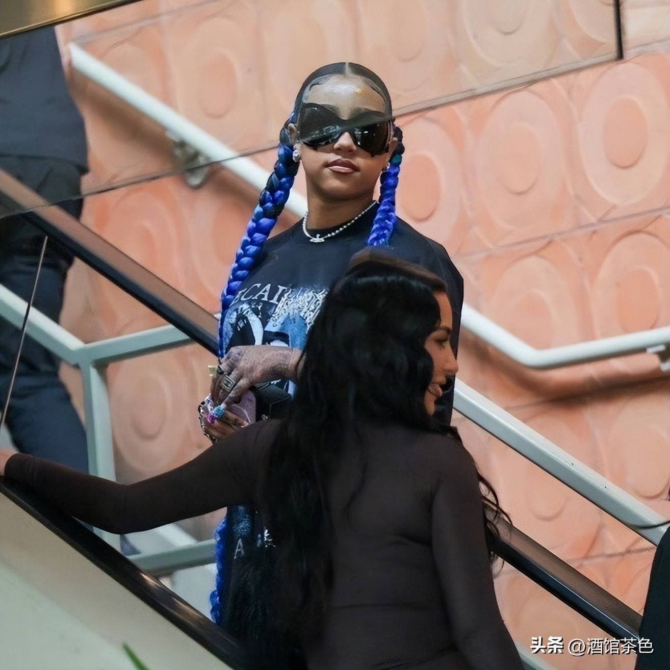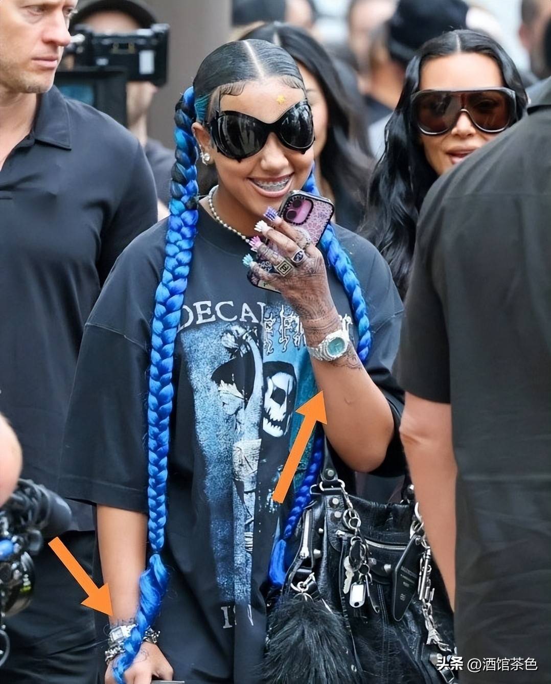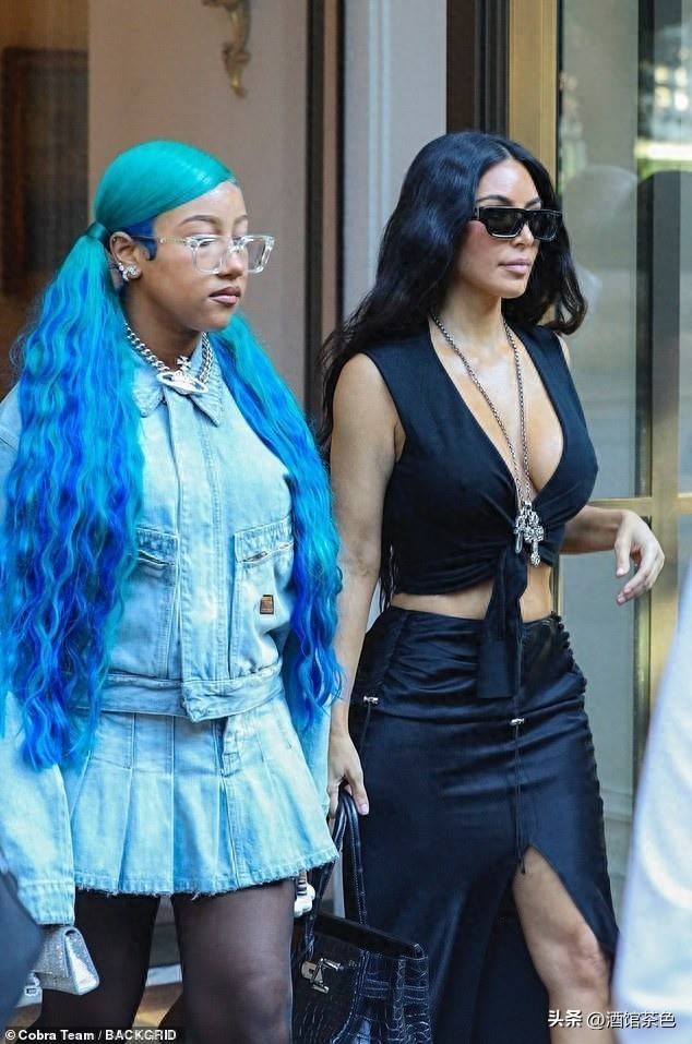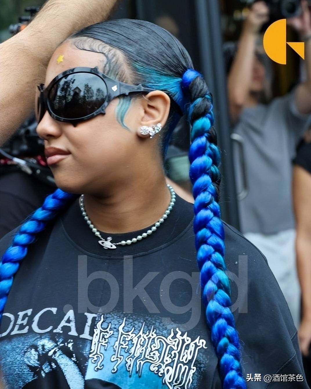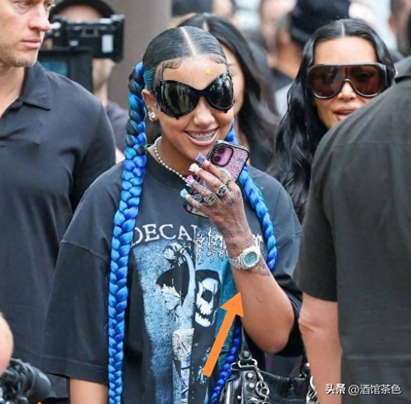 她头顶一抹极具视觉冲击力的蓝绿色长辫,搭配 oversized 墨镜与布满双手的彩绘纹身,整体造型完全颠覆了公众对十二岁少女的固有印象。这般成熟的装扮风格不禁让人联想到她那位以时尚实验精神著称的父亲坎耶,甚至在某些方面展现出更强烈的个人特色。