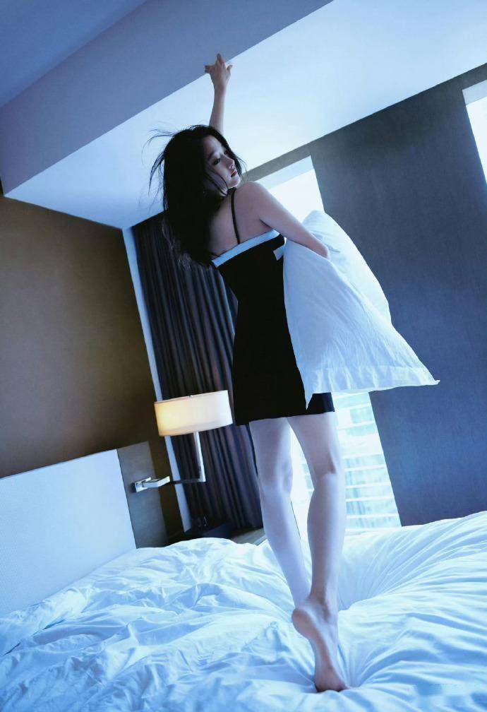 先看她这一身穿搭,黑白拼接的吊带裙简约又有设计感,紧紧贴着身材,把她的好身材衬得恰到好处。尤其是那双腿,又长又直,皮肤还白到发光,往那儿一坐或者一站,就是妥妥的 “腿精本精”。而且她在写真里的状态特别松弛,有时候光着脚在床边玩耍,有时候抱着枕头露出甜美的表情,纯欲感直接拉满。