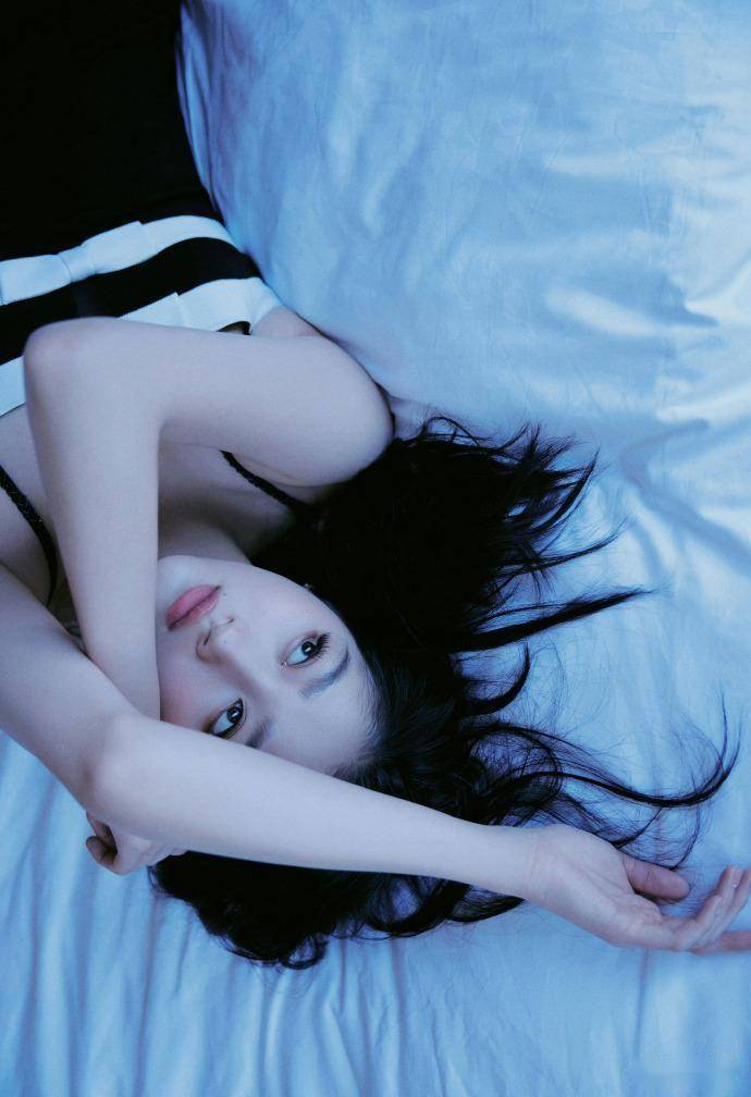 再说说这组写真的氛围,整体是偏清冷的蓝调,衬得她皮肤更白皙了。她的头发自然地散落着,有时候带着点凌乱感,眼神里时而无辜时而又带着点小勾人,这种反差感把纯欲风的精髓拿捏得死死的。不管是趴在床上托着下巴,还是靠在沙发上秀出大长腿,每一个动作都充满了魅力,让人看了移不开眼。
