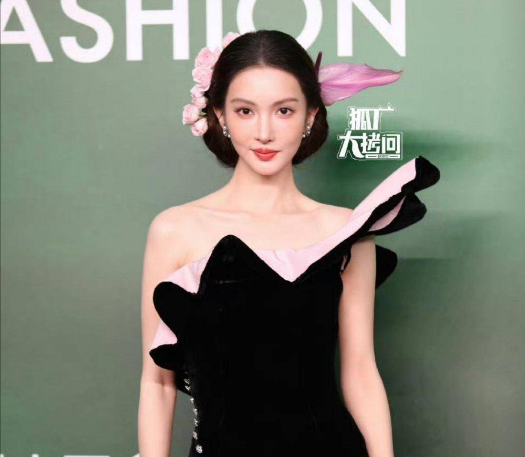 金晨选择黑粉撞色礼服,高开衩设计展现修长腿部线条,发髻间点缀的鲜花与主题巧妙呼应,被赞如“江南细雨中的清荷”。