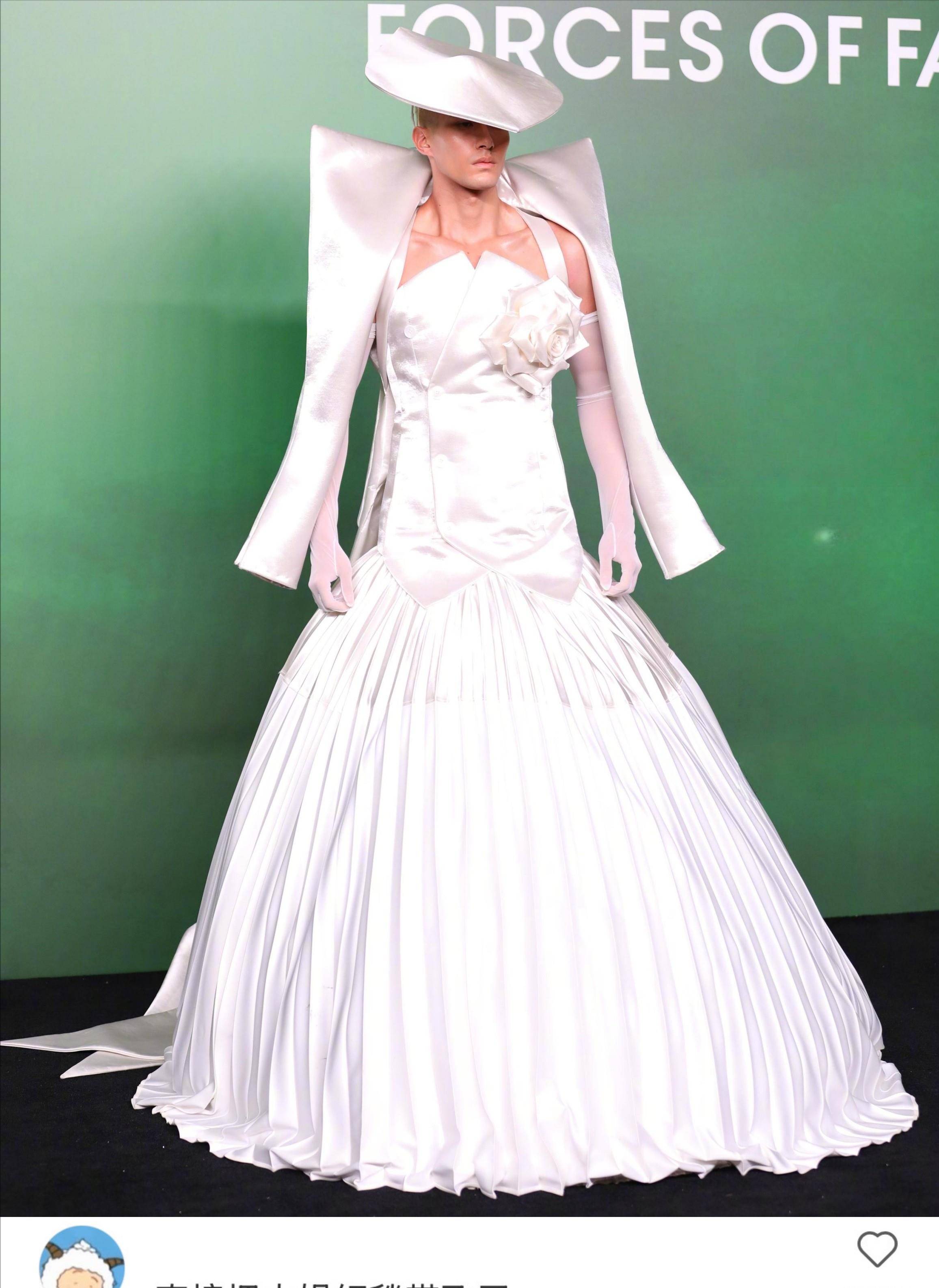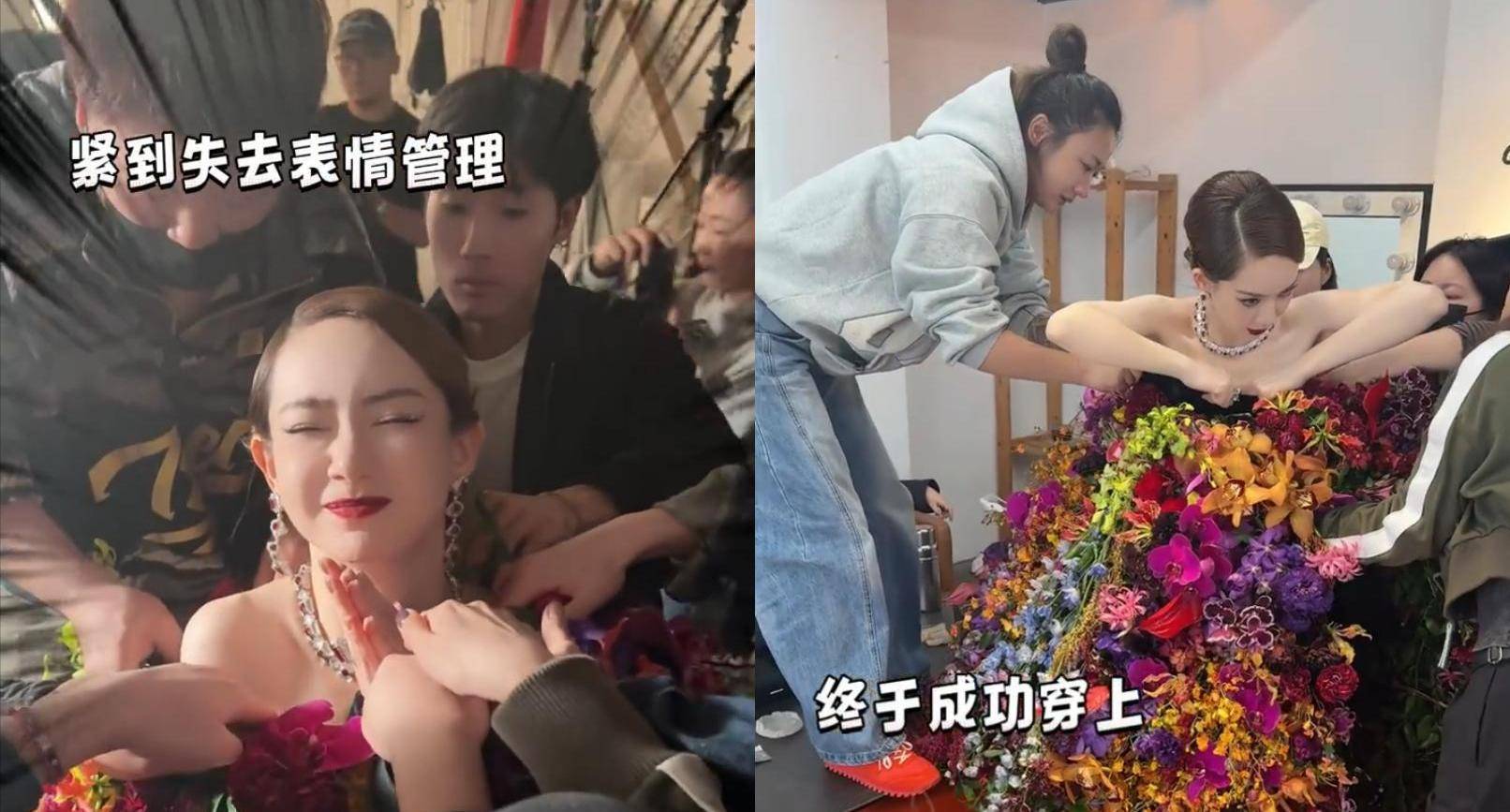 戚薇的礼服缀满数百朵鲜花,需要两人协助托举裙摆。更令人担忧的是她对花粉过敏,曾因过敏反应面部肿胀,此次可谓冒险之举。