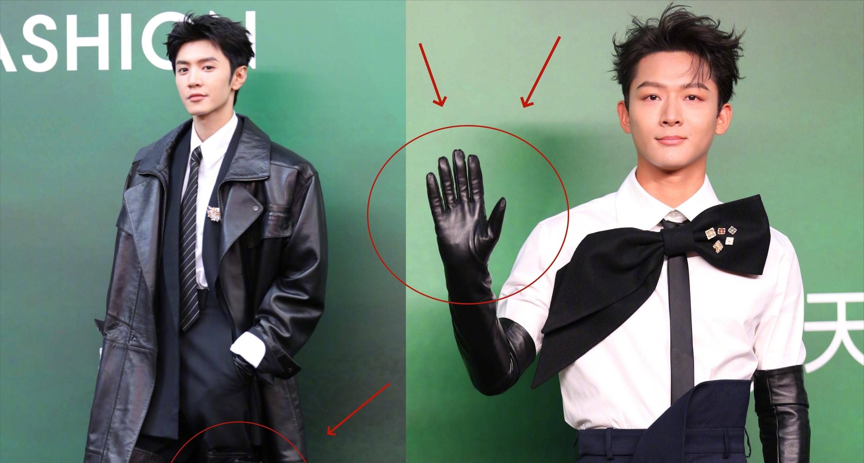 张晚意的深色西装本应稳重,过肘皮手套与巨型蝴蝶结的搭配却制造出矛盾感。
