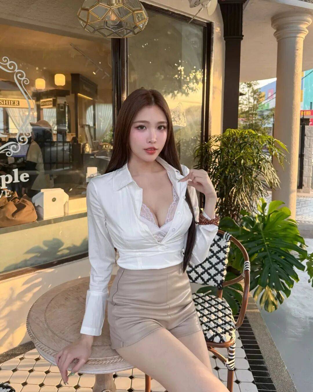她的颜值自带 “异域精致感”:肌肤是少见的雪白瓷质,通透得像裹了层月光,没有东南亚常见的蜜色暖意,却多了份清冷细腻,哪怕在强光下也不见毛孔,衬得妆容愈发亮眼;最标志性的是她的鹰钩鼻 —— 鼻梁高挺却带着精致的弧度,不是尖锐的凌厉,而是像被精心雕琢的艺术品,鼻尖微微下勾,恰好与饱满的红唇形成绝妙呼应,她偏爱哑光正红或复古暗红唇膏,唇线勾勒得利落分明,红唇如泼墨朱砂,与鹰钩鼻的立体线条碰撞出强烈的异域风情;再配上深邃的杏眼,眼尾微微上挑,眼神里藏着慵懒的气场,不笑时是高级冷感,笑时唇角轻扬,又添了几分柔和,让 “颜” 的层次格外丰富。