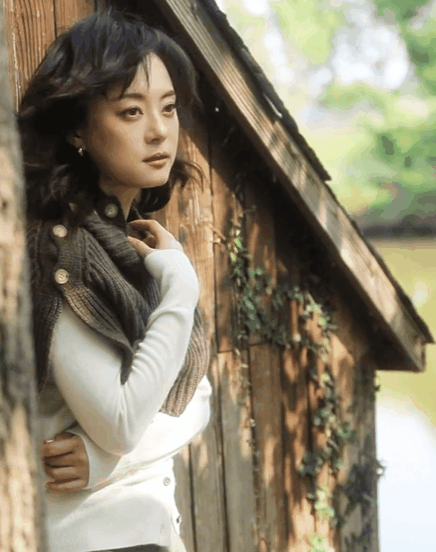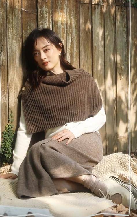 但最令人惊艳的,莫过于孙俪穿着白色针织衫和棕色半身裙的第三套造型。棕灰色的坎肩与秋日的氛围相得益彰,长发随风飘动,站在爬山虎覆盖的楼梯旁,她无意造型,眼神温柔地注视镜头,却展现出一种浓郁的故事感,令人不禁为之动容。