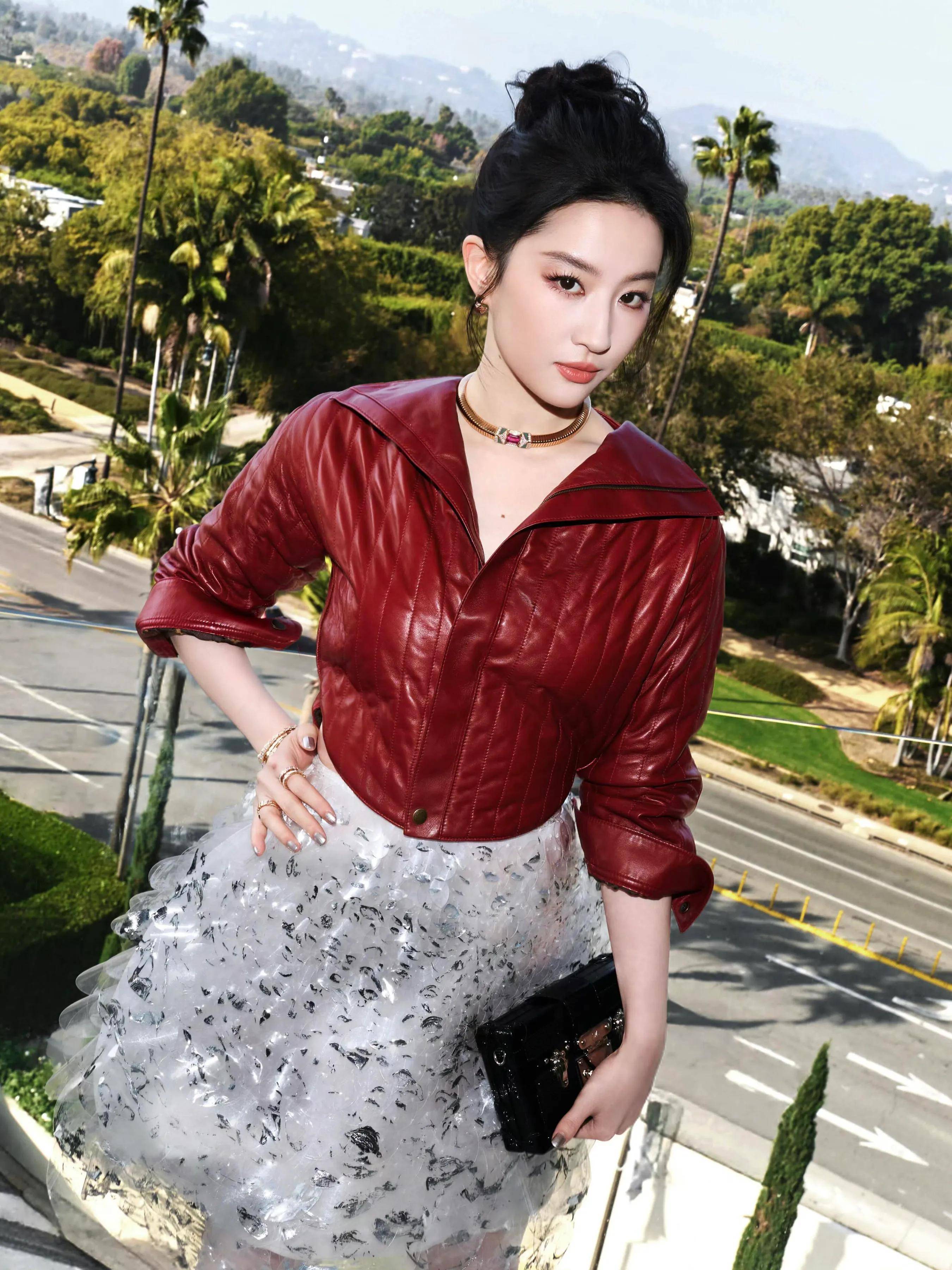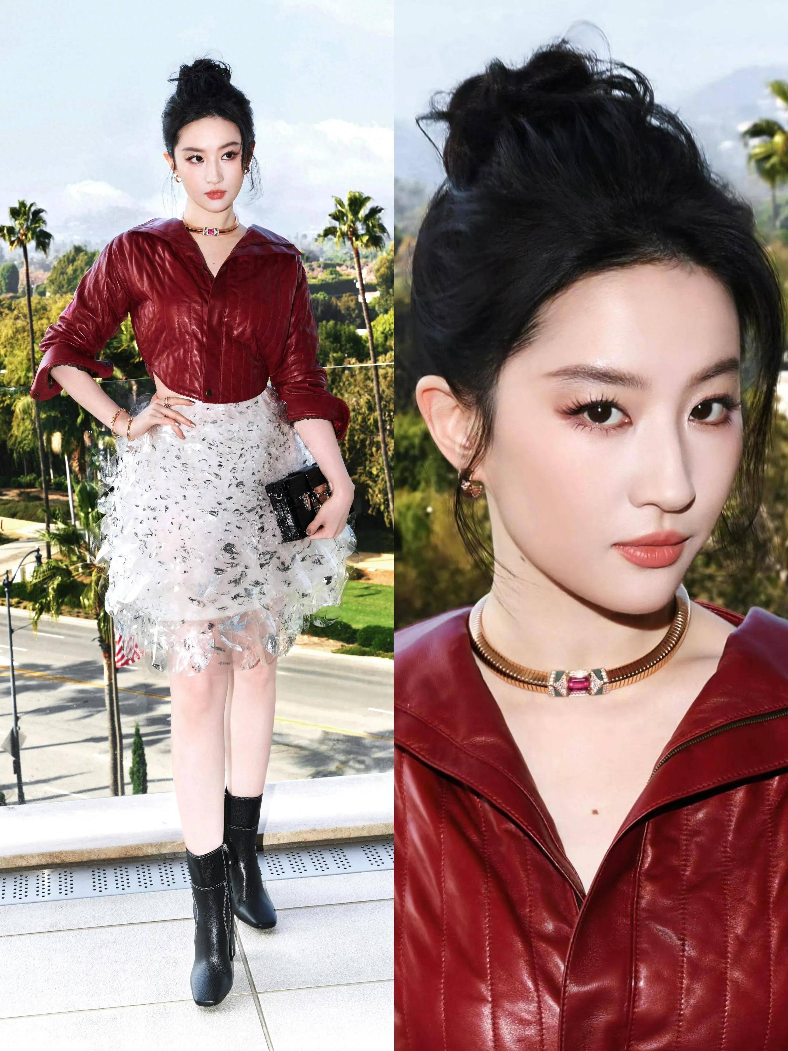 在参加完国内的Vogue活动之后,刘亦菲毫不迟疑地飞往洛杉矶,继续她的国际时尚之旅。这次她的造型格外引人注目,红色的皮质上衣搭配闪亮的白色短裙,活力十足。她的丸子头发型加上精致的妆容,呈现出既飒又美的效果,给人一种花木兰般的气质。手中握着的LV手拿包与她佩戴的宝格丽珠宝更是令人无法忽视她与这些大牌的亲密关系。刘亦菲的这身打扮堪称完美,银色美甲与红色皮衣相得益彰,整体造型既前卫又充满力量感。