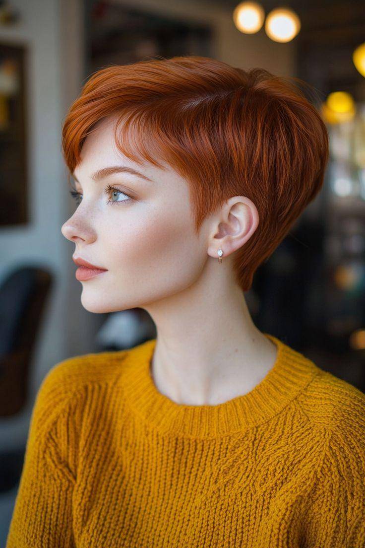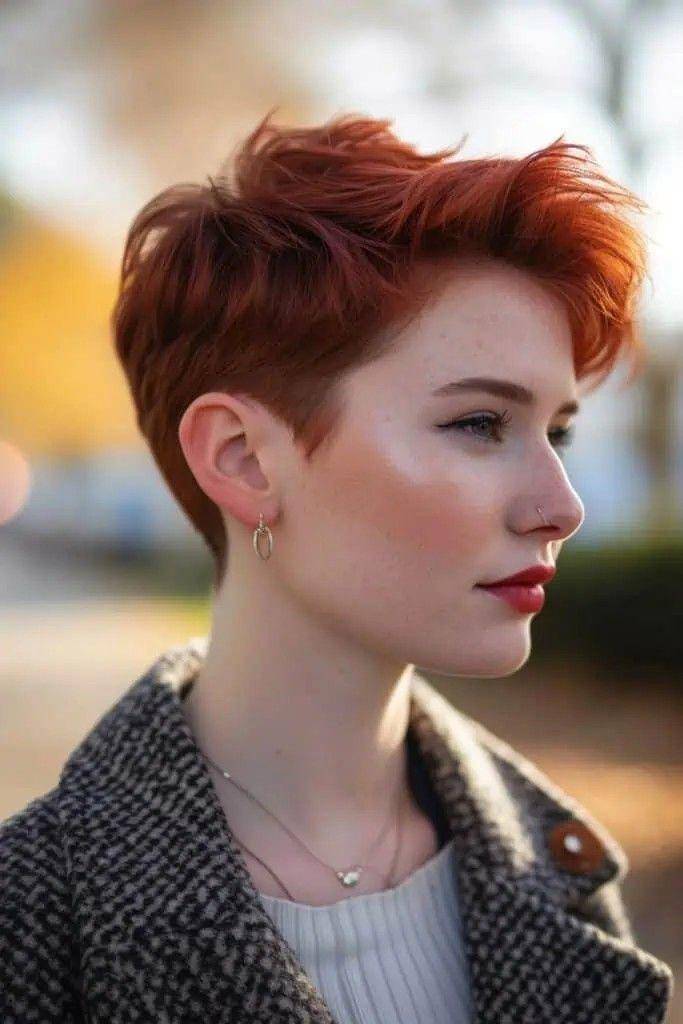 用红棕、橙红等高饱和度发色染透顶部纹理,是潮人们的“出片密码”。红棕的热烈撞上剃短的利落,既能压住亮色的浮夸,又能让纹理层次在光线下清晰可见——搭配金属项链与西装外套,是街头酷感;换上针织毛衣与珍珠耳饰,又能透出“甜酷交织”的轻熟感。这种“可盐可甜”的兼容性,让它成为音乐节、时尚活动的“造型首选”。