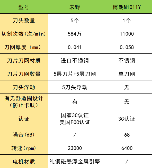 未野、博朗迷你便携往复式剃须刀怎么选?哪个牌子好?如下图就是关于这两款产品的性能数据啦,来对比了解一下吧。