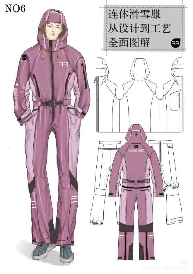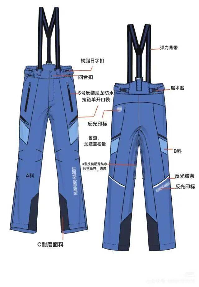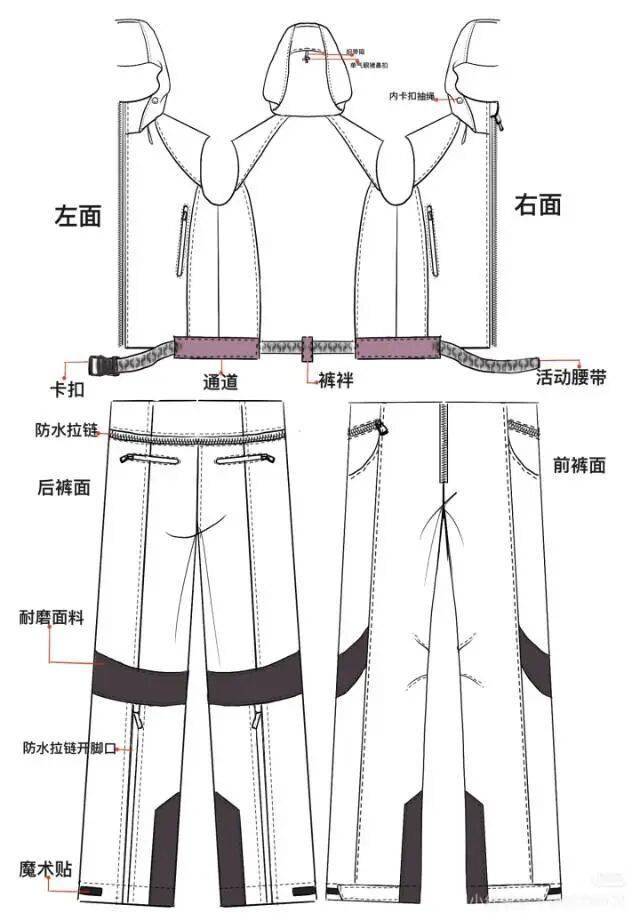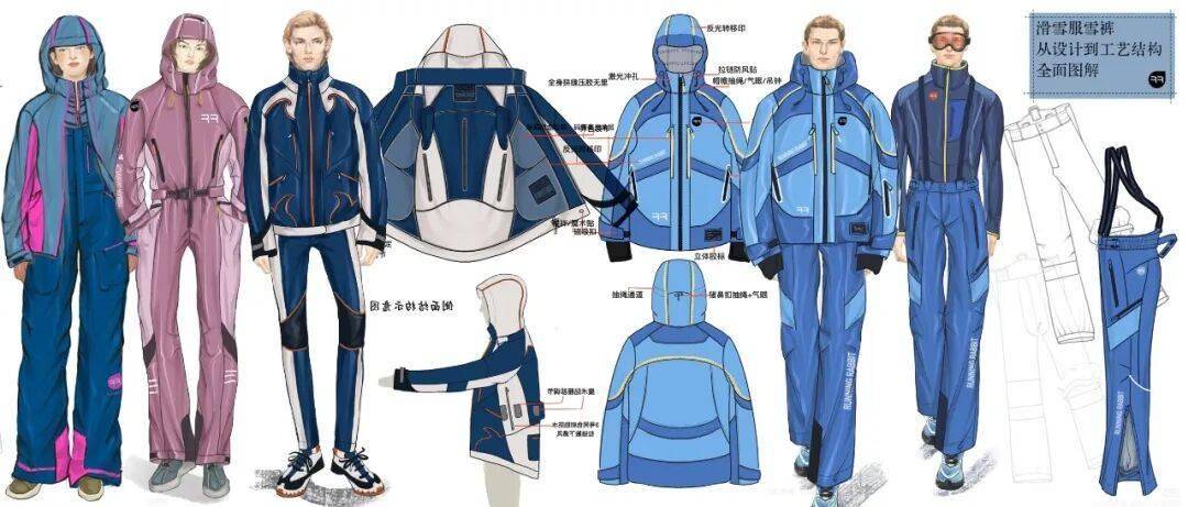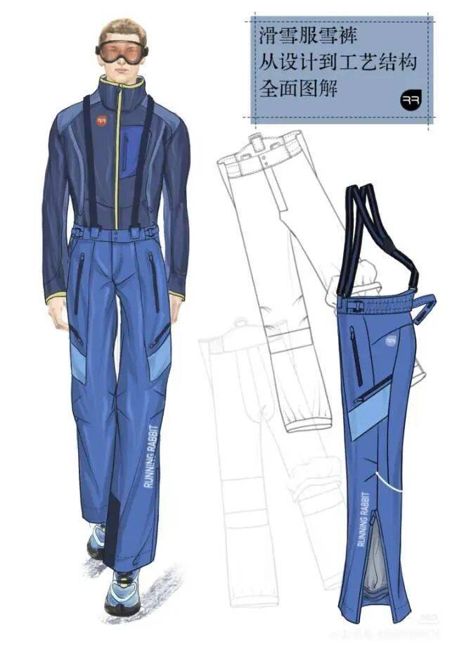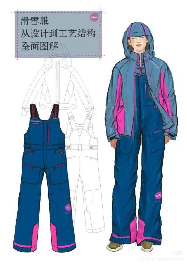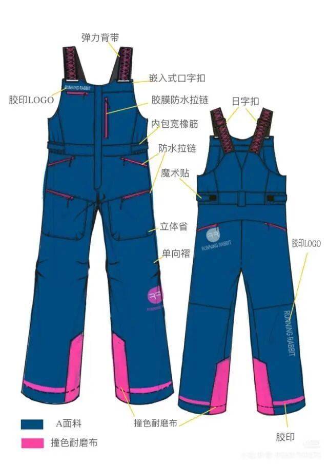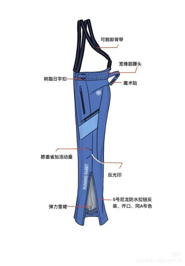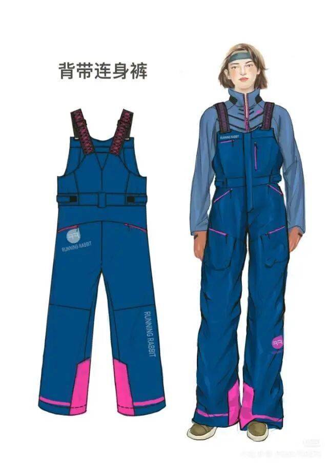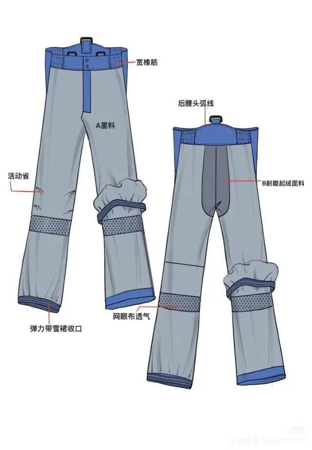 滑雪服则分为连体和分体两种,连体设计防止进雪效果好,分体设计则通常有带背带的高腰裤,防止滑行时雪从腰部进入。