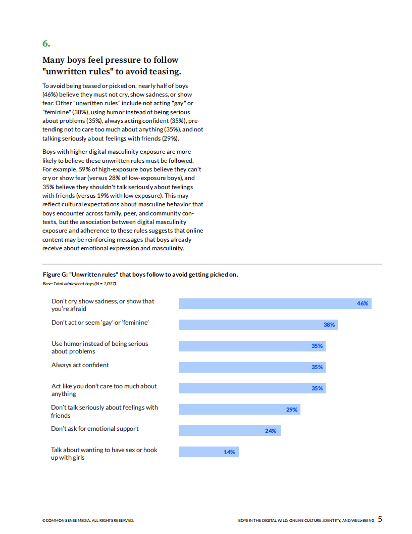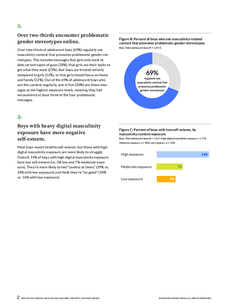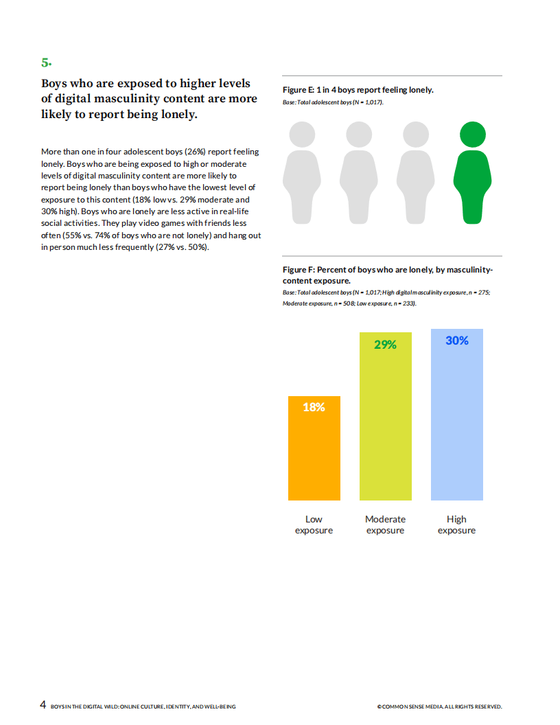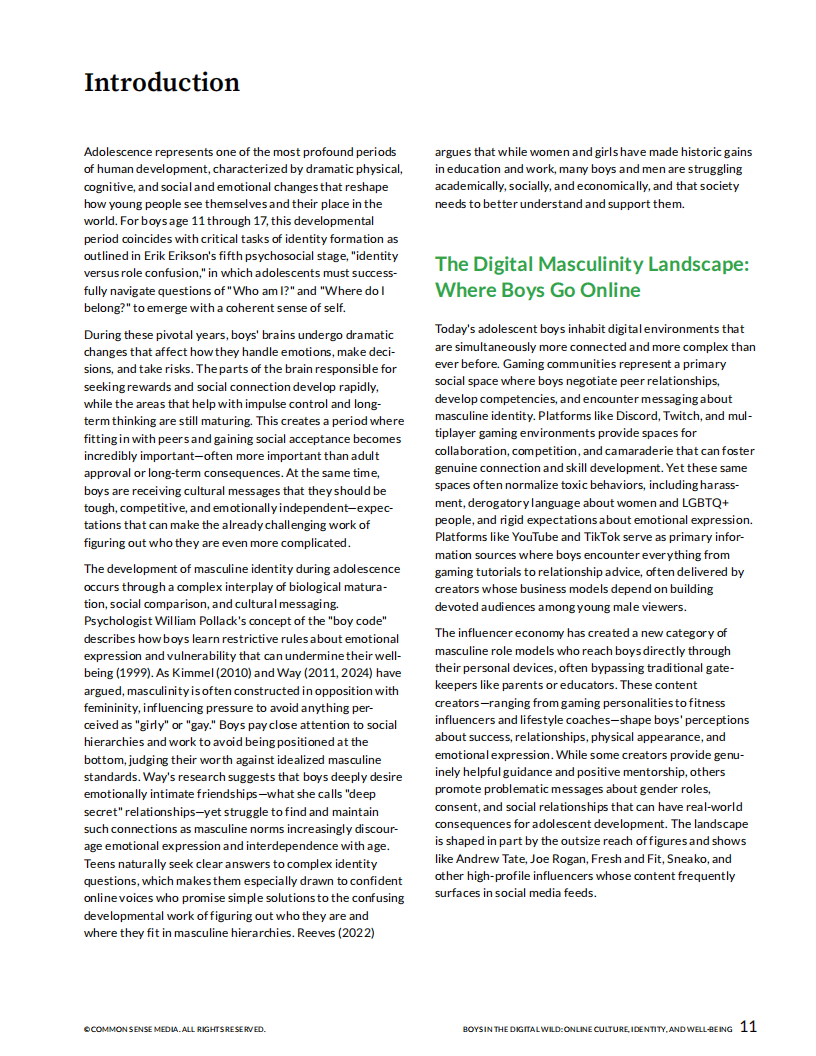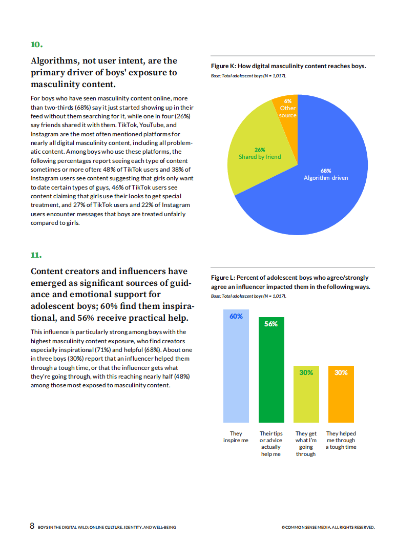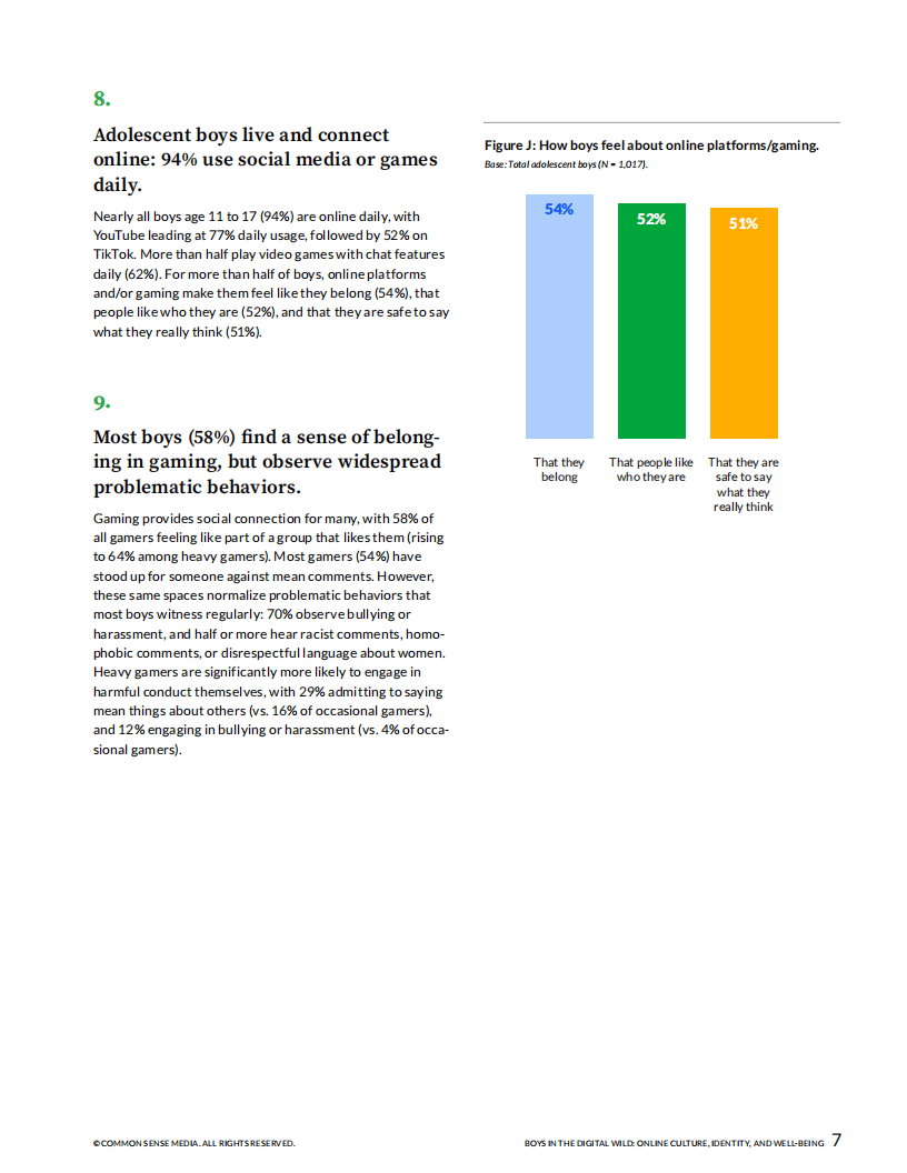 男孩线上参与度极高,94%每日使用社交媒体或玩游戏,YouTube(77%)和TikTok(52%)使用率领先,62%每日玩带聊天功能的游戏。58%的游戏玩家在游戏中获得归属感,但70%曾目睹霸凌或骚扰,半数以上听过种族主义、恐同或不尊重女性的言论,重度玩家更易参与有害行为。算法是男孩接触男性气质内容的主要途径(68%),TikTok、YouTube和Instagram是主要平台。