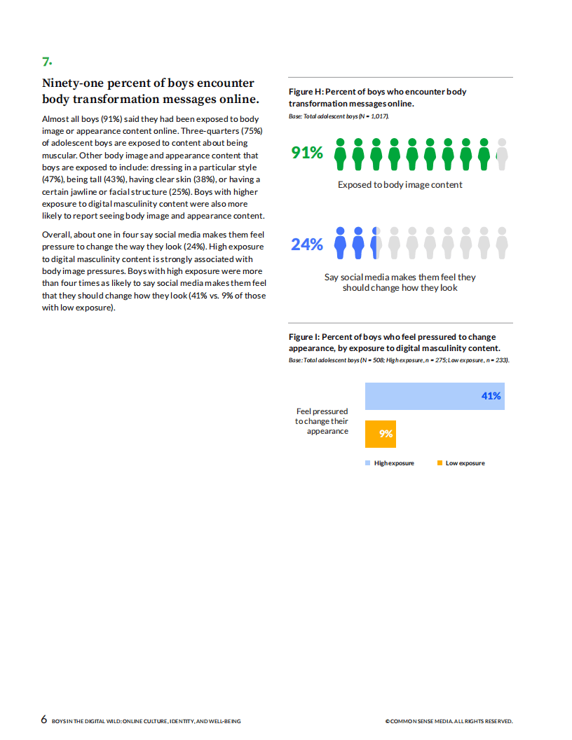 调查显示,73%的男孩经常接触男性气质相关内容,23%接触程度较高,主要涉及赚钱(44%)、增肌(39%)和打斗或武器(35%)等主题,且年龄越大接触越多。69%的男孩常看到带有问题性别刻板印象的内容,包括女孩只愿与特定类型男性约会、利用外貌获取想要的东西等,其中20%高频接触此类信息。