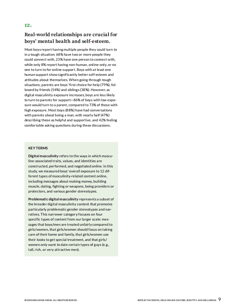 现实人际关系对男孩身心健康至关重要,79%的男孩在困境中首选父母求助,68%拥有两位以上可求助的人,这类群体自尊水平更高。88%的男孩与父母讨论过“如何成为男子汉”,47%认为这类对话有帮助。同时,60%的男孩认为网络创作者具有启发性,56%从中获得实用帮助,高接触男性气质内容的男孩对创作者的认可度更高。
