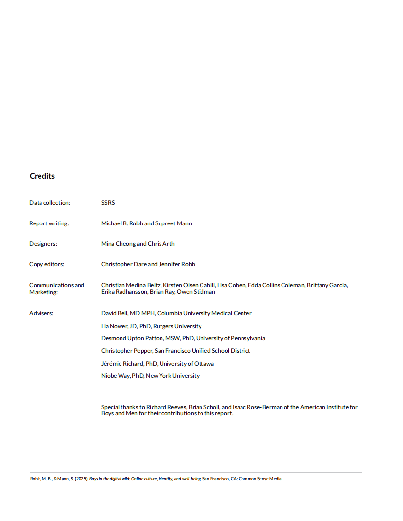 Common Sense Media于2025年7月对美国1017名11-17岁青春期男孩开展全国代表性调查,聚焦数字环境对男性身份发展的影响,核心探讨男孩在社交媒体与游戏社区的参与模式、线上男性气质内容接触情况及其对情绪健康、自尊和现实关系的作用。