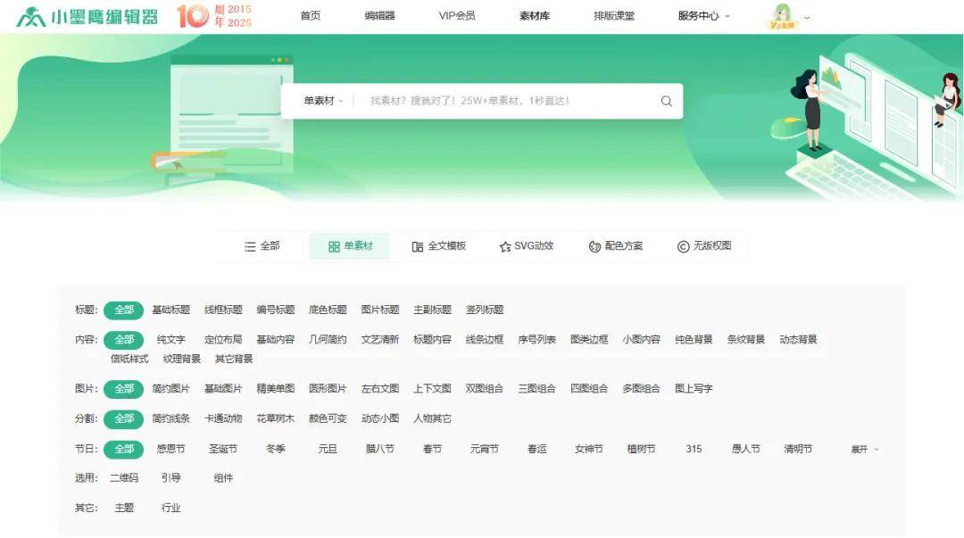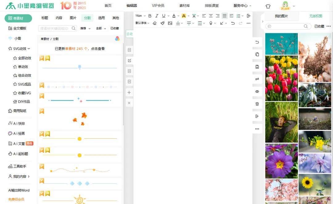 后来我用上了小墨鹰编辑器自带的素材库,感觉省心了不少。它在编辑器的左侧就有入口,点进去就能看到一个分类清晰的素材库。里面东西挺全的,不光有常见的图片和图标,还有整套的配色方案、各种风格的装饰边框和分割线。