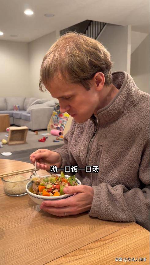 并且,他还学会了中国人的吃饭方法:一口饭一口汤,可真是被小黄影响的不浅。
